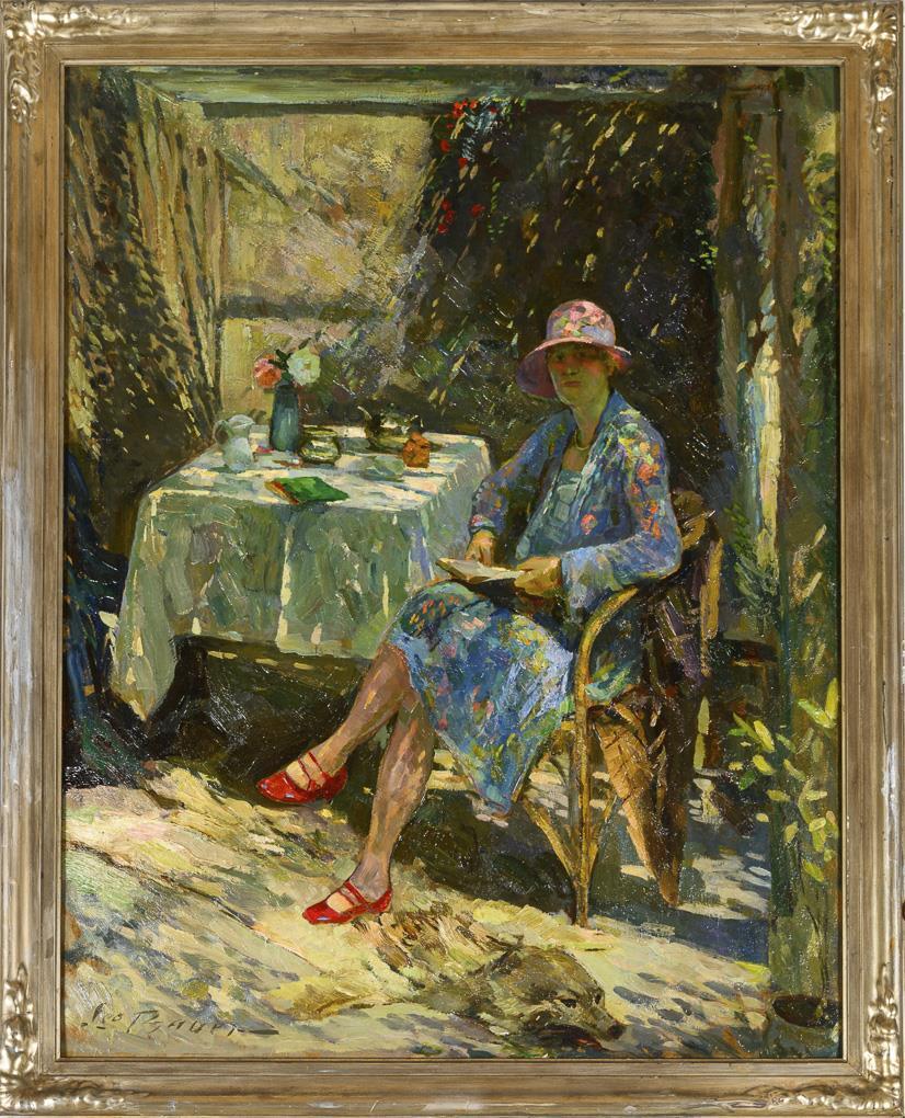 Lesende Frau in einem Stuhl im Garten unter Schatten spendenden Pflanzen. Leichte Altersspuren.