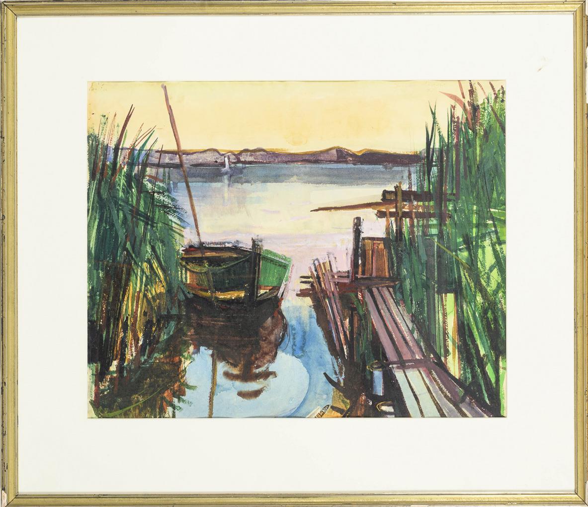 Das Boot zwischen Schilf und Steg mit Blick hinaus auf den See.