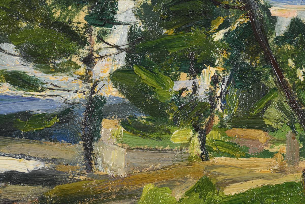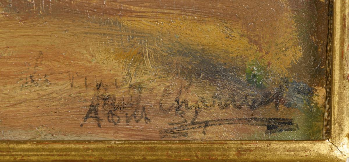 Öl/Leinwand. Rechts unten undeutlich signiert mit Ortsbezeichnung Aout, verso auf Klebezettel des Kunsthauses Schaller bezeichnet. (19)54.