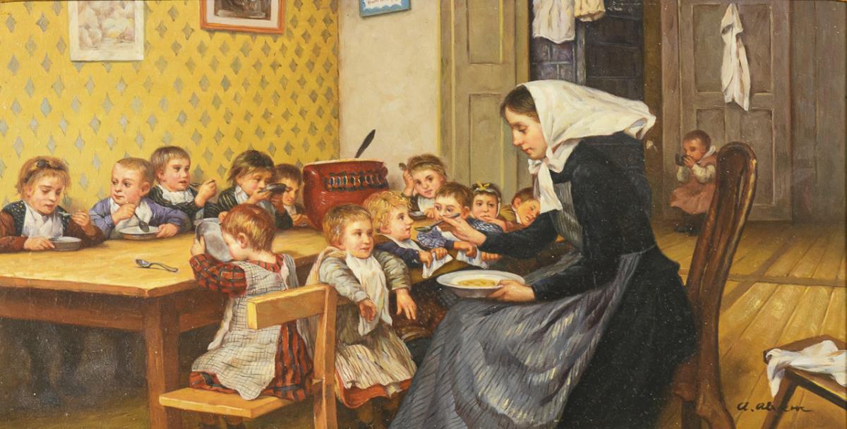 Undeutlich signiert: Im Kindergarten