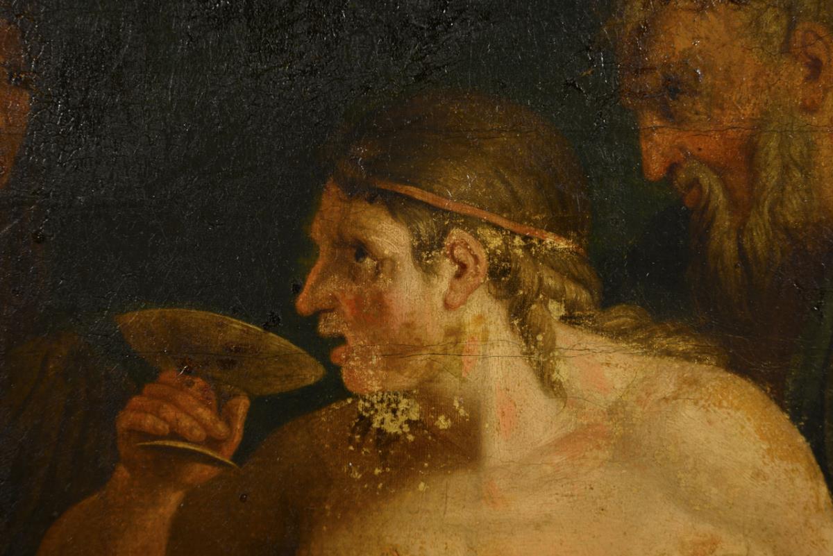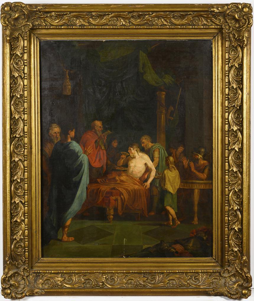 Der geschwächte makedonische König beim Trinken und Zuhören auf dem Bett, während andere Berater und Ärzte um ihn stehen. Leinwand doubliert.