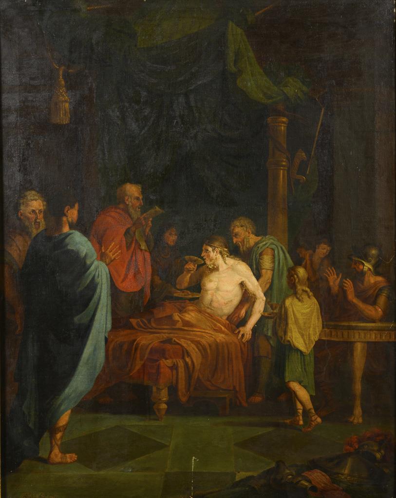 Der geschwächte makedonische König beim Trinken und Zuhören auf dem Bett, während andere Berater und Ärzte um ihn stehen. Leinwand doubliert.