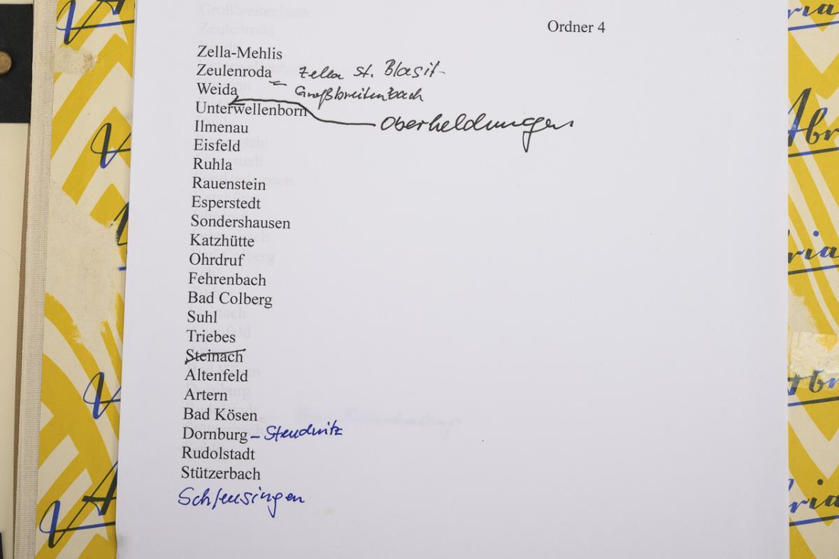 Inflationsgeld ("Gutscheine", "Platzanweisungen", "Lohnscheck", "Notgeld") z.B. aus Blankenhain, Schmiedefeld, Gräfenthal, Pößneck (hier teils aus Leder), Apolda, Meiningen, Schleiz, Sitzendorf, Schmalkalden usw.. 1x handschriftlich mit Stempel ausgestellt, wenige Handschriftkopien, vereinzelt "ungültig, Musterexemplar", einige "bezahlt" gestempelt. Einige vollständige Sätze. In 4 Alben Auflistung der Ortsnamen. Kaum stockfleckig, Alben teils einige Alters-/Gebrauchsspuren.