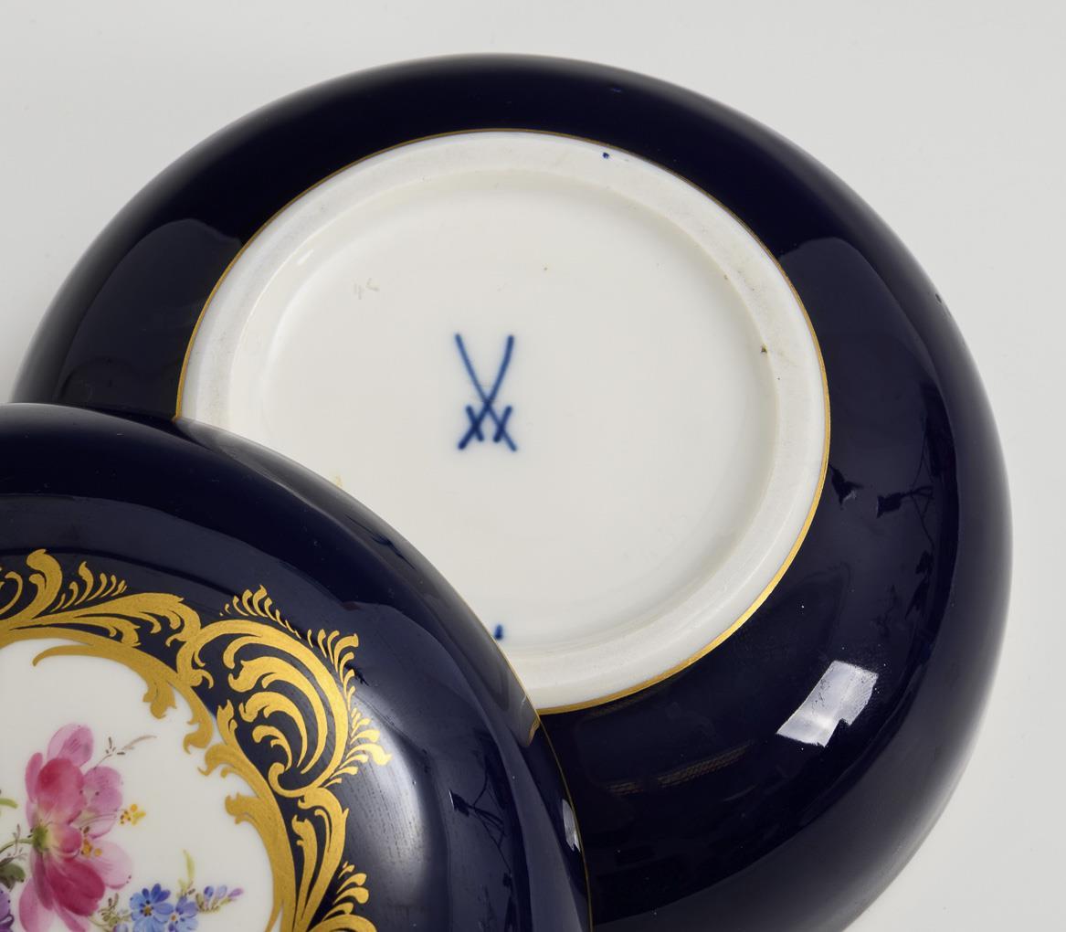 Dose mit Kobaltfond und Blumenmalerei. Meissen.