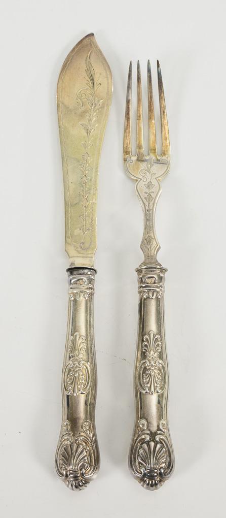 Dekoratives, reich reliefiertes Besteck mit gravierten Zinken und Klingen aus Silber. In originalem, braunen Kasten mit blauer Samtausstattung. Wenige Zinken minimal verbogen.