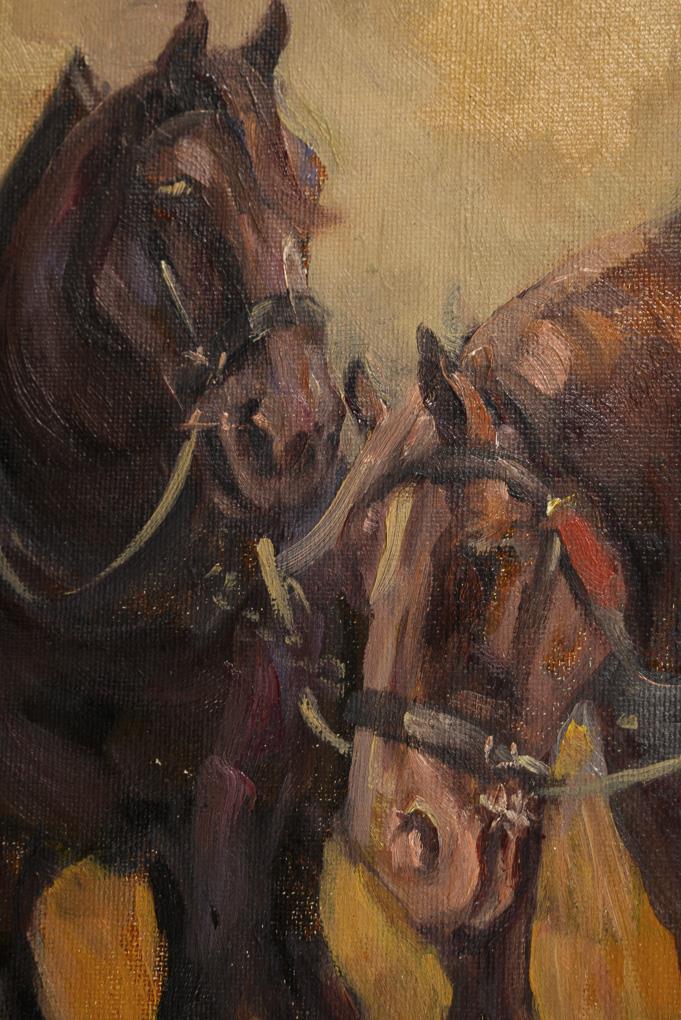 Der Bauer beim Anspannen des Pfluges an die beiden Pferde neben einem Kornfeld.