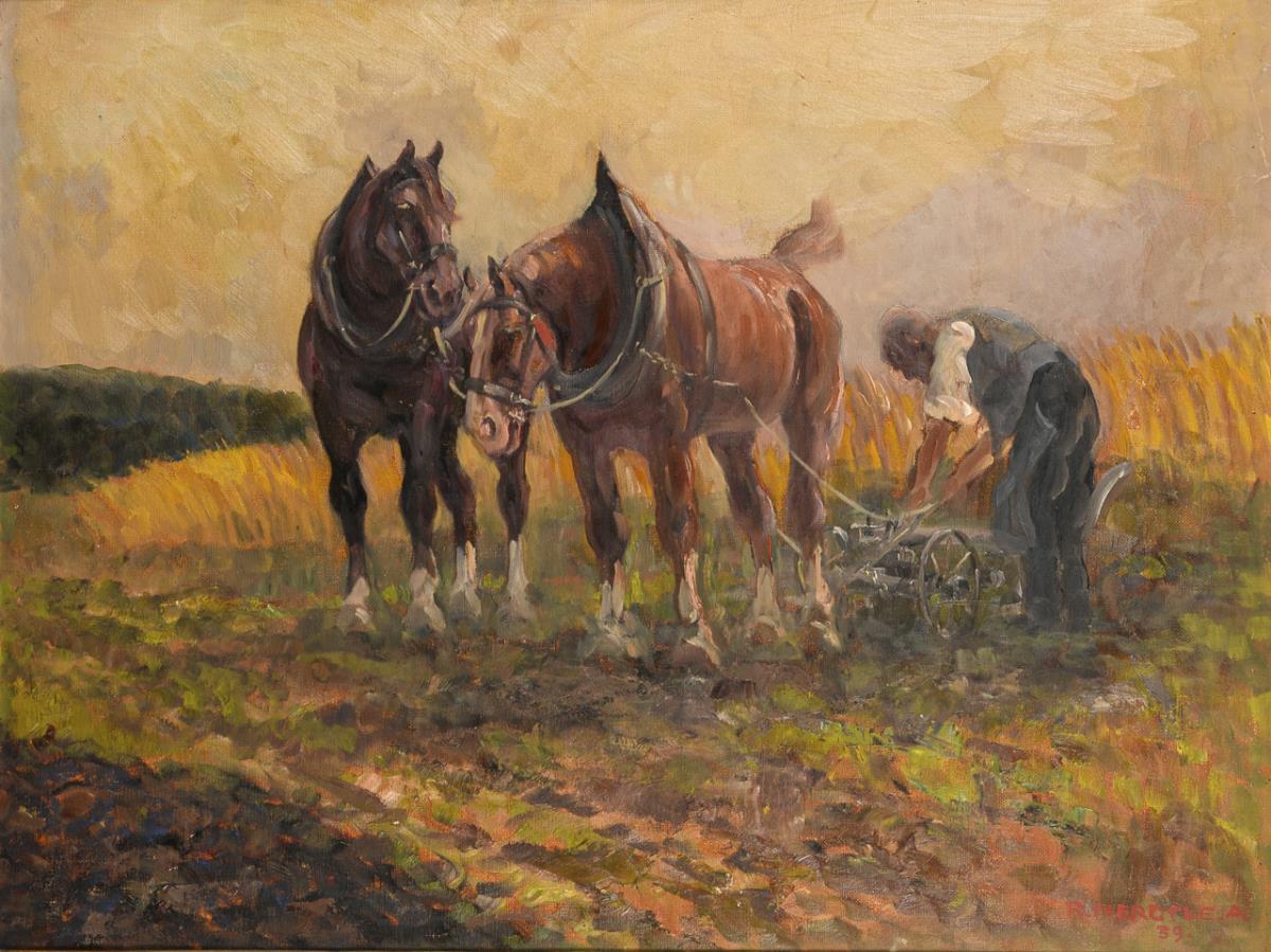 Der Bauer beim Anspannen des Pfluges an die beiden Pferde neben einem Kornfeld.