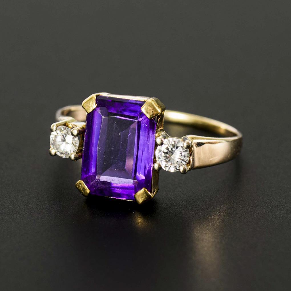 Krappengefasster Amethyst und 2 chatongefasste Brillanten zwischen schmaler Schiene.