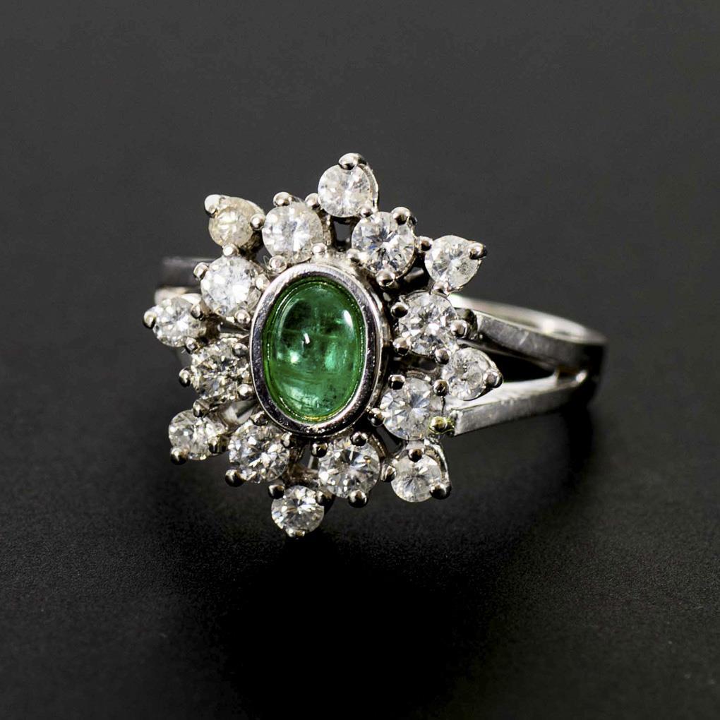 Weißgold 585 gestempelt. Smaragd ca. 1,04 ct. Brillanten zus. ca. 0,72 ct/G-H/vs-si. Ringgröße 58. 6 g.