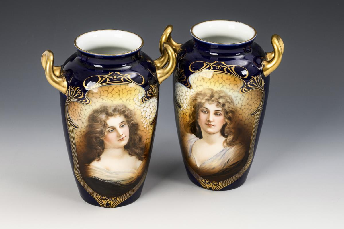 Paar Jugendstil-Vasen mit Frauenbildnissen. Rosenthal.