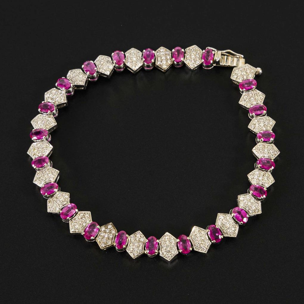 Weißgold 750 gestempelt. Rubine zus. ca. 4,84 ct. Brillanten zus. ca. 2,42 ct/J-K/vvs-vs. 18 x 0,8 cm. 16,5 g.