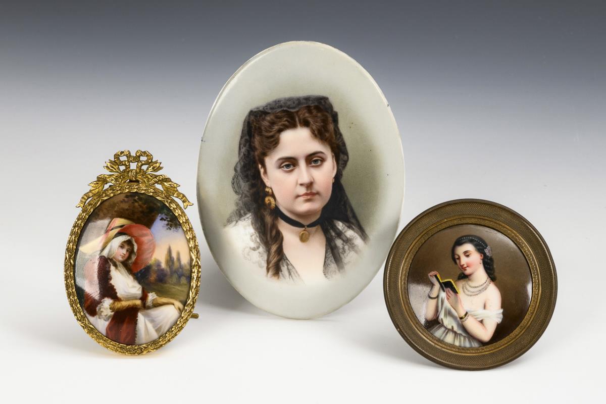 1x ovale Plakette mit dem Porträt einer jungen Dame mit schwarzem Spitzenkopftuch (L 15,5 cm). / 1x runde Plakette mit dem Bild einer lesenden jungen Dame (Ø 6,7 cm). / 1x ovale Plakette mit der Darstellung einer unter einem Baum sitzenden jungen Dame mit großem Hut (L 8,5 cm; im Messing-Aufstellrahmen, L 11 cm).