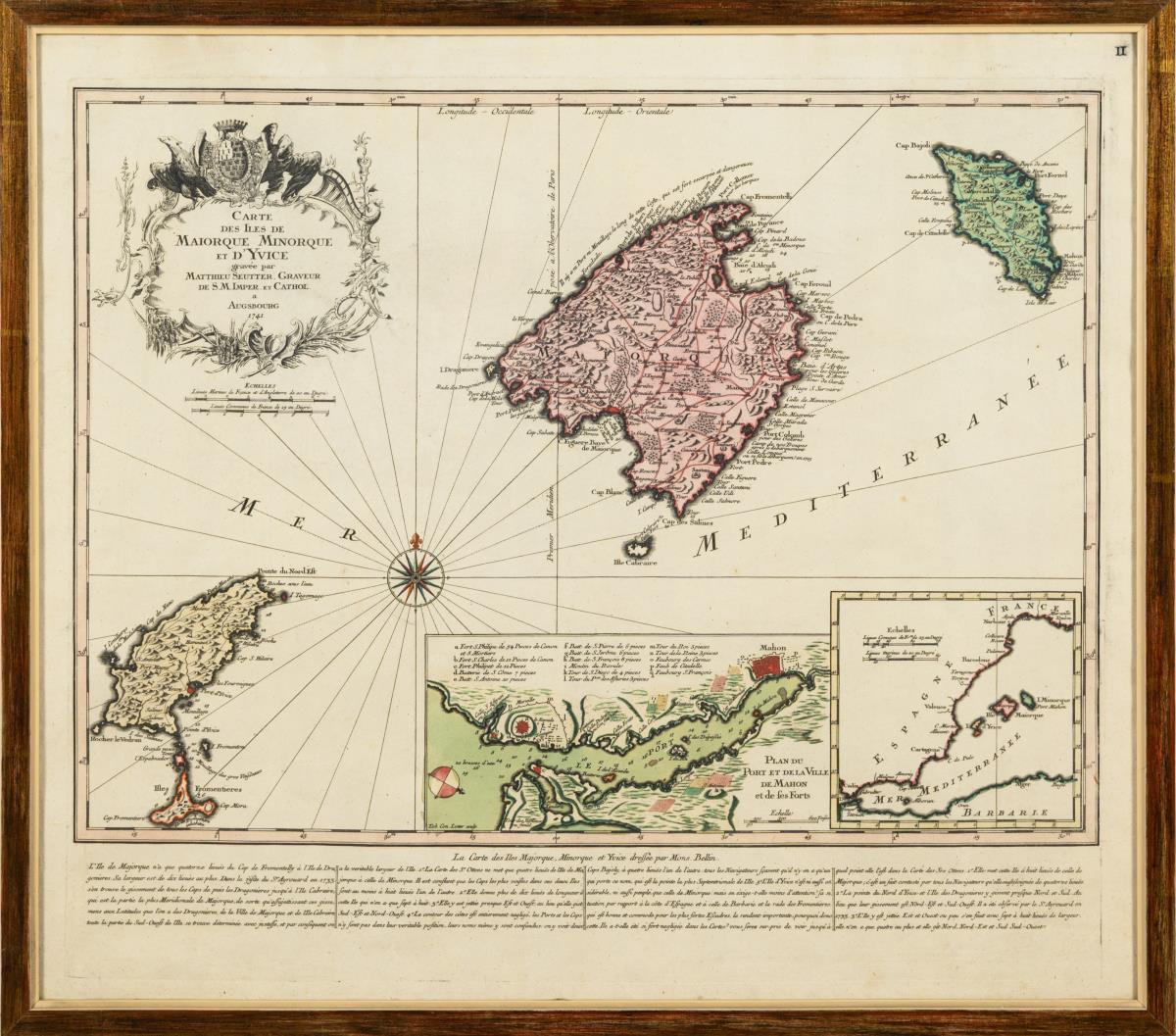 Historische Landkarte der Balearen mit den Inseln Mallora, Menorca und Ibiza "Carte des Isles de Amiorque, Minorque et d'Yvice [...]", mit Beikarte der Befestigungen und des Hafens von Mahón, dem wichtigsten Schiffsverkehrsplatz auf Menorca und Beikarte des westlichen Mittelmeers mit den Küsten von Spanien, Frankreich und Algerien, im unteren Randbereich Begleittext in französischer Sprache. Etwas griffspurig.