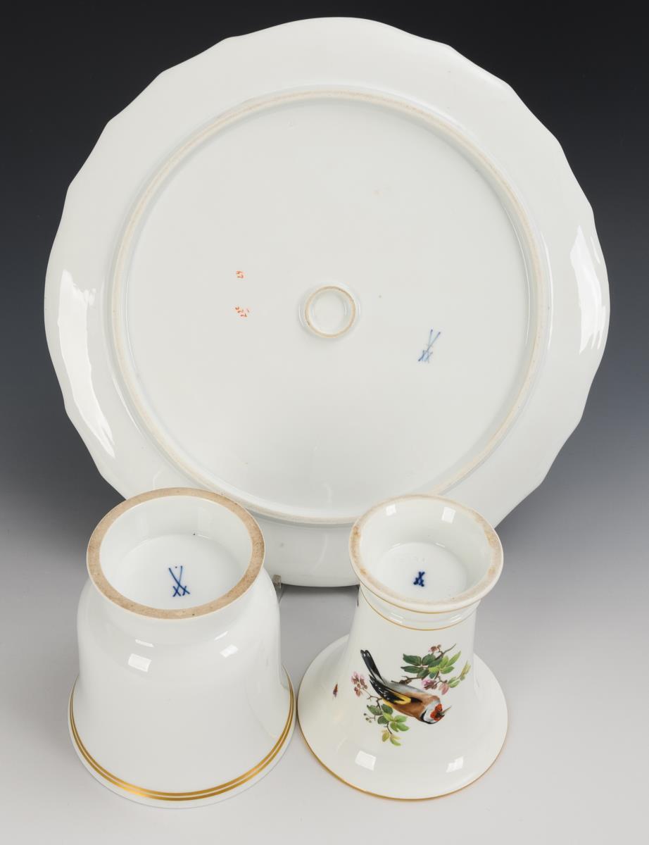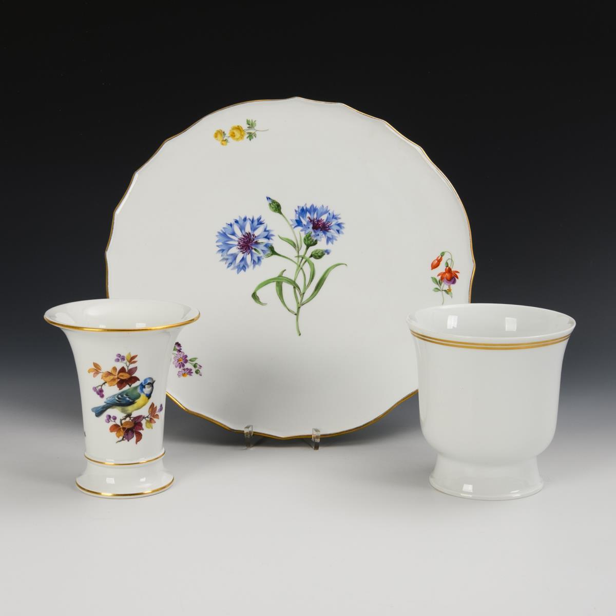 1x Tortenplatte mit Blumenmalerei, Form "Neuer Ausschnitt" (Ø 33 cm). / 1x Kratervase mit Vogelmalerei (H 13,5 cm). / 1x weiße Vase mit Goldstaffage (H 13 cm). Goldrand der Tortenplatte etwas berieben.