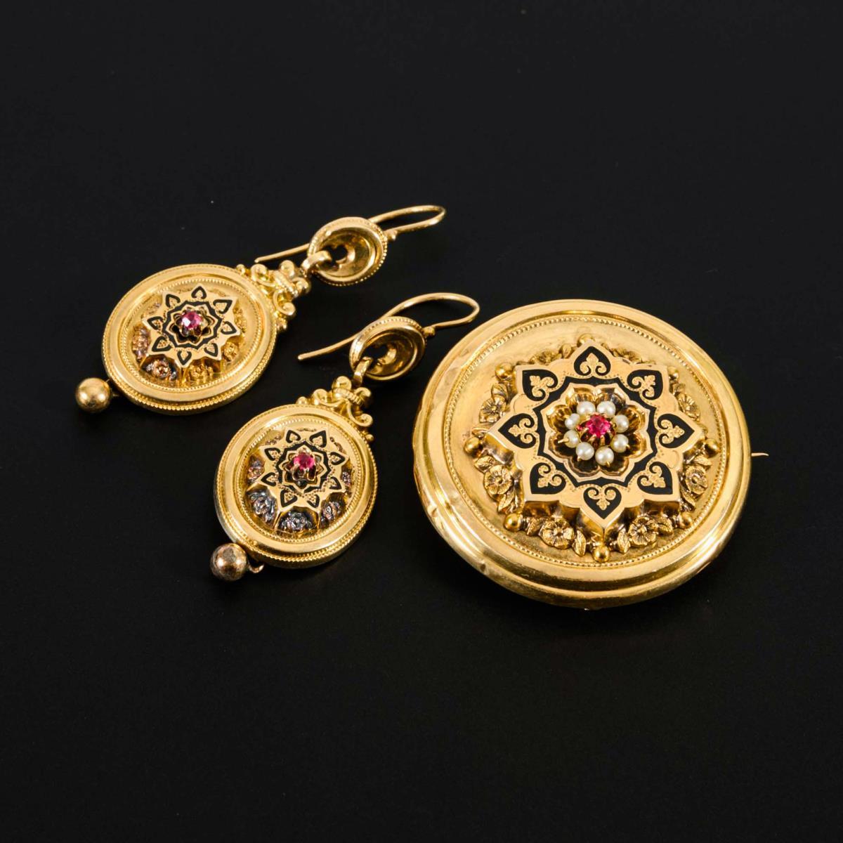 Biedermeierbrosche und Ohrhängerpaar, im Originaletui.