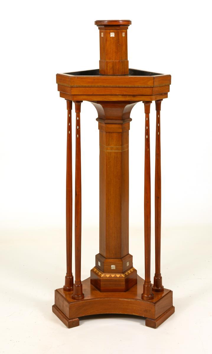 Dekorativer Blumenständer auf dreipassig gestaltetem Sockel mit Mittelstütze und 3 Säulenpaaren, trapezförmiges Pflanzgefäß mit Metalleinsatz und mittigem Blumenpodest; dezent verziert mit kleinen Intarsien aus Perlmutt (?) und umlaufenden Bandintarsien. Alters-/Gebrauchsspuren, Metalleinsatz mit Korrosionsspuren.