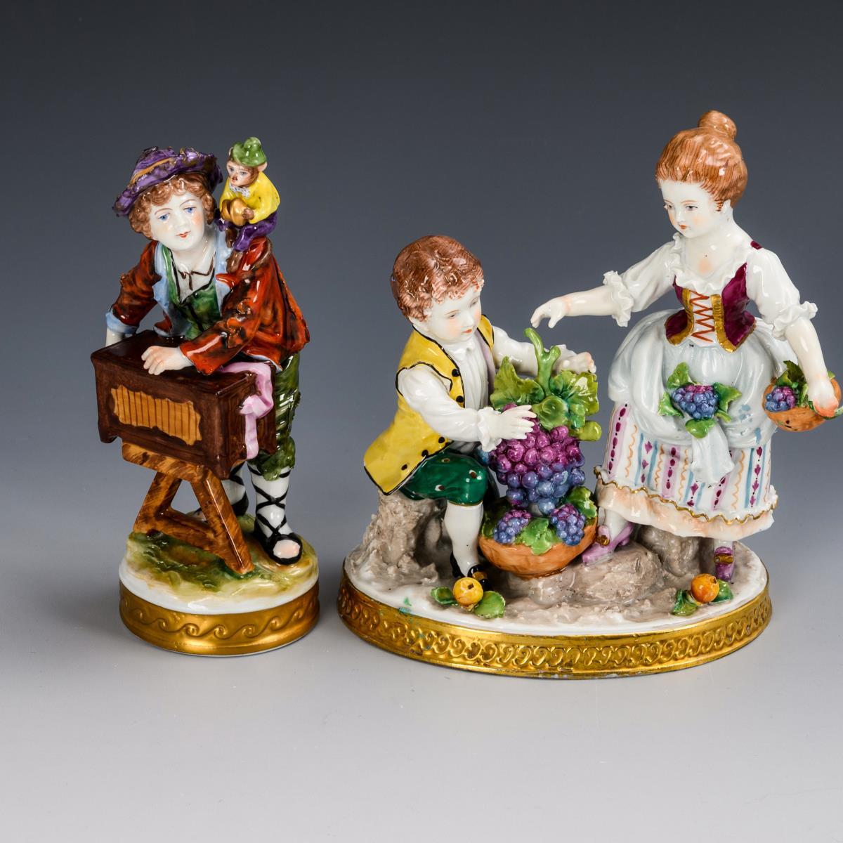 1x Neapelmarke: Paar Gärtnerkinder mit Früchten (H 15 cm). / 1x Älteste Volkstedter, Modell-Nr. 10742: Bettelkind mit Leierkasten und Äffchen (H 15 cm). Bestoßung an der Sockelkante des Kinderpaares.