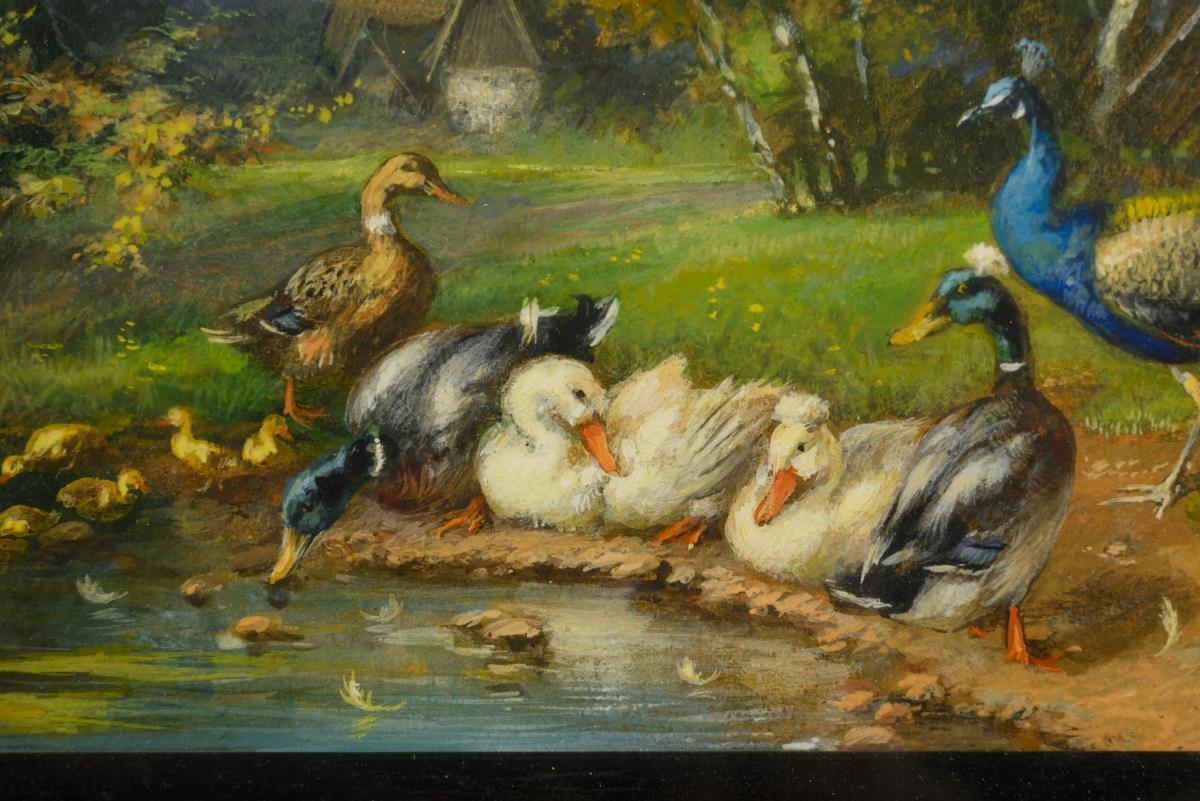 Die Enten mit den Jungtieren und einem Pfauenpaar am Ufer eines Gewässers nahe den Häusern.
