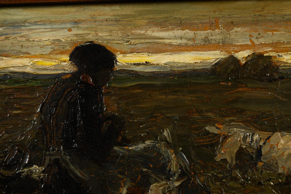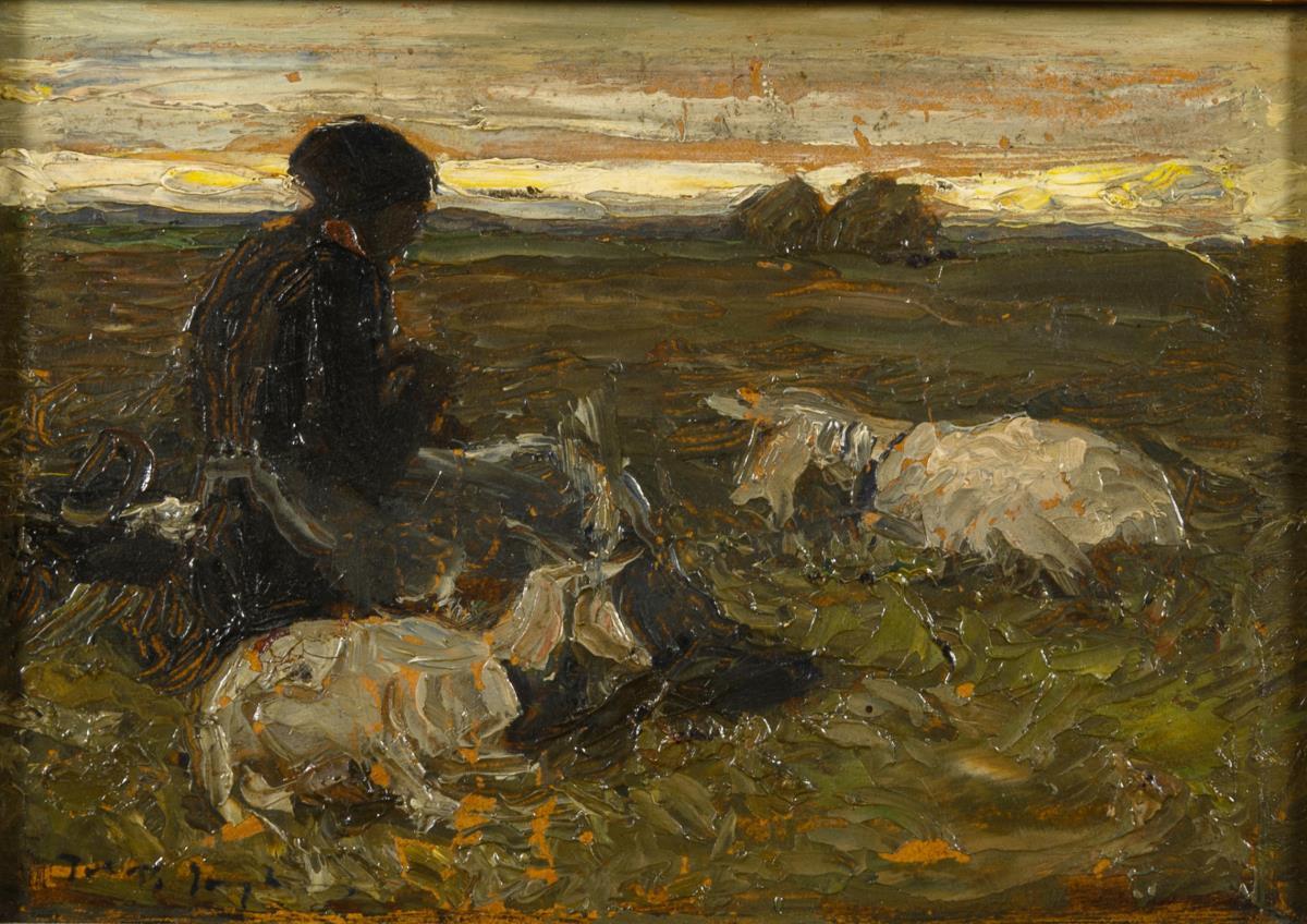 Die Frau mit den Ziegen bei der Rast in weiter flacher Landschaft. Wenige Farbabsplitterungen.