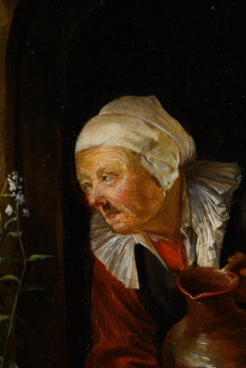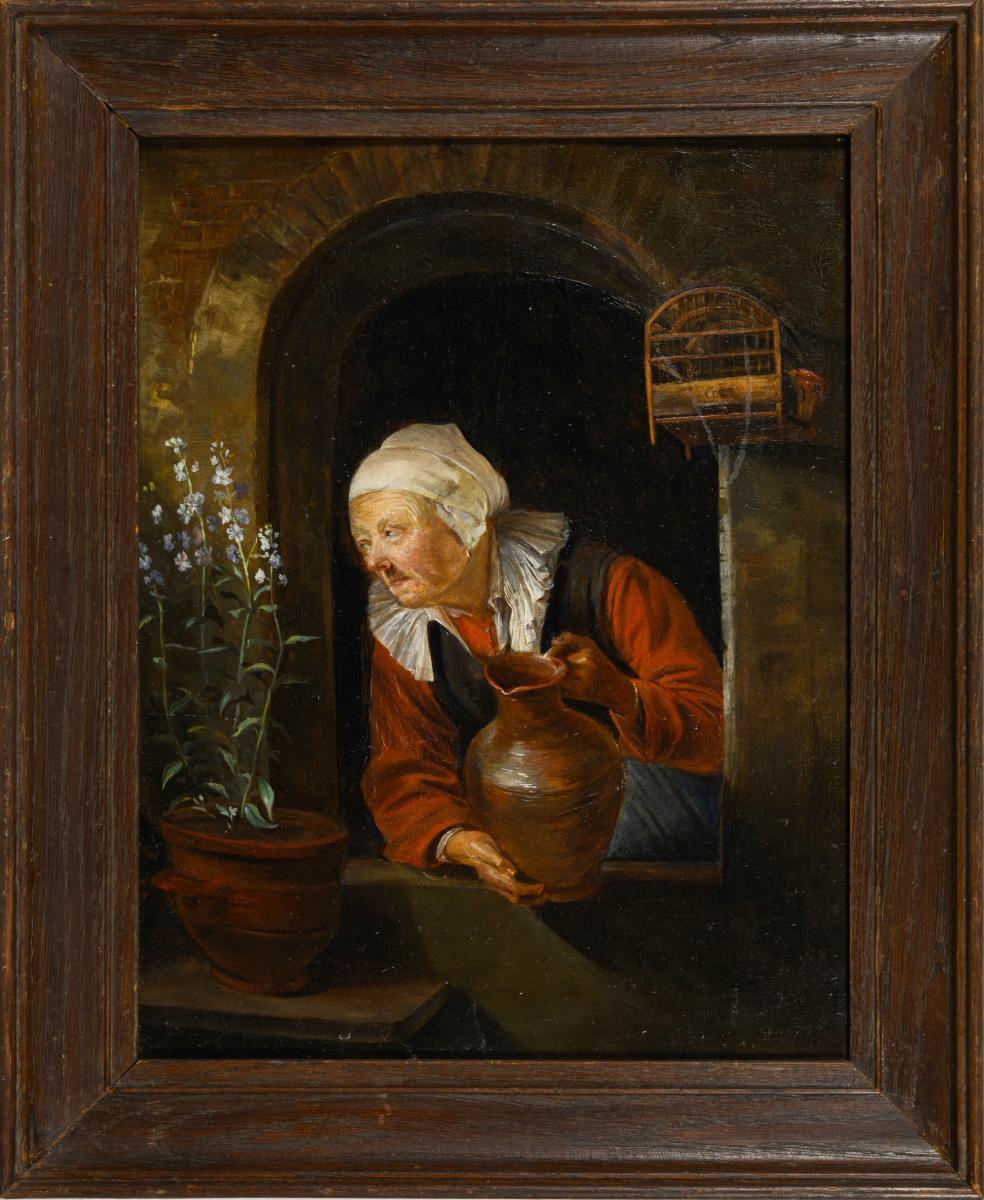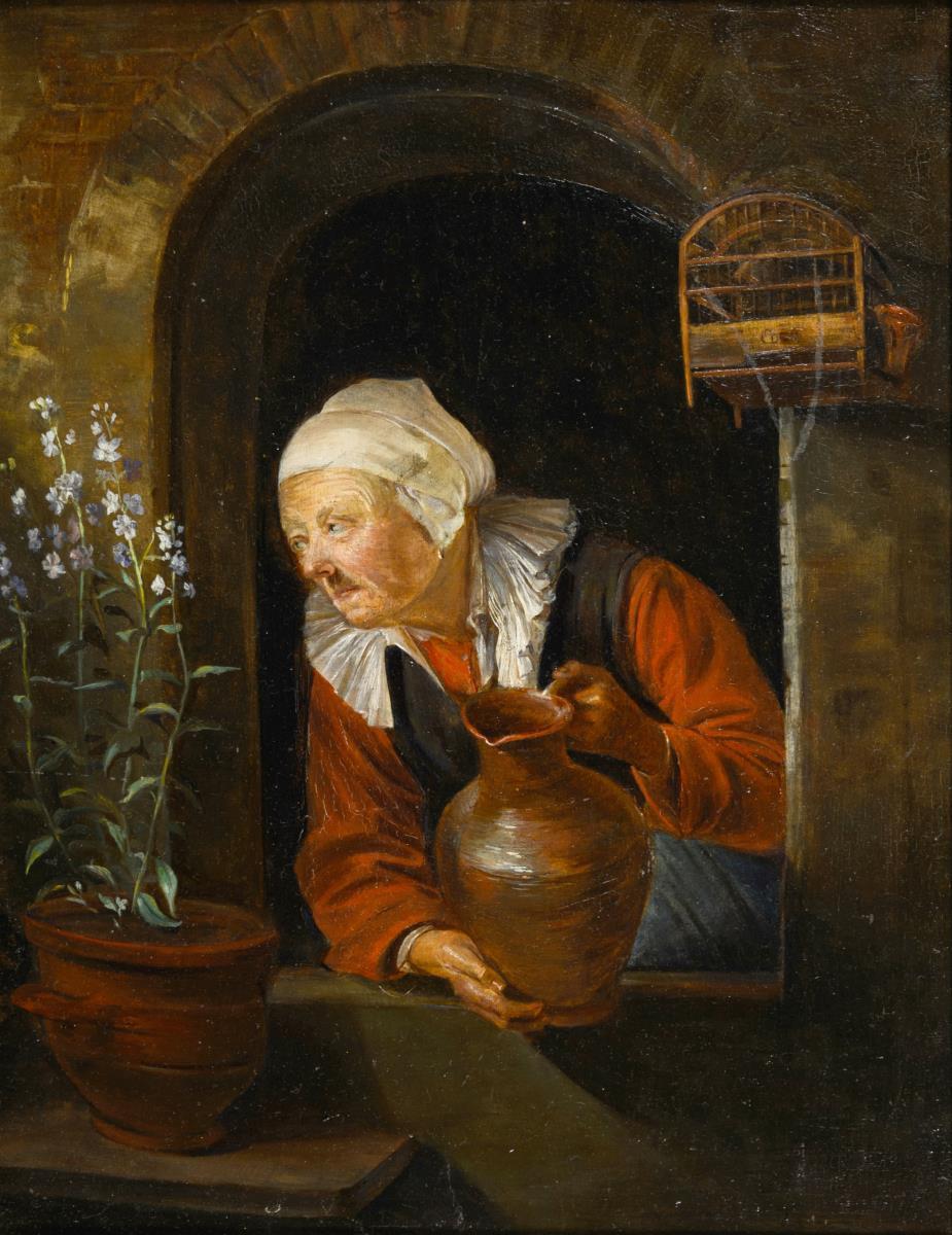 Ältere Frau mit Wasserkanne am Fenster neben einer Topfpflanze und einem Vogelkäfig. Minimale Altersspuren.