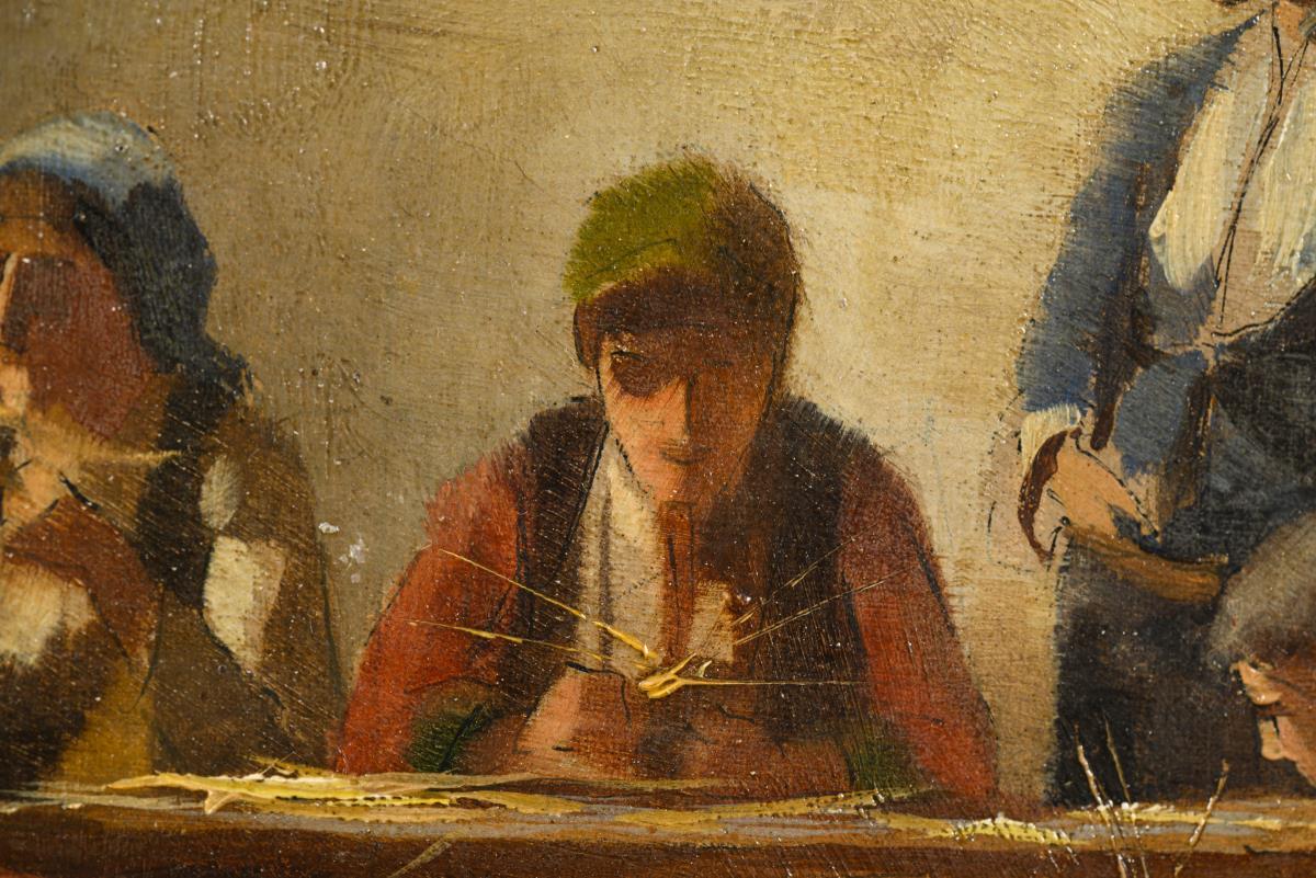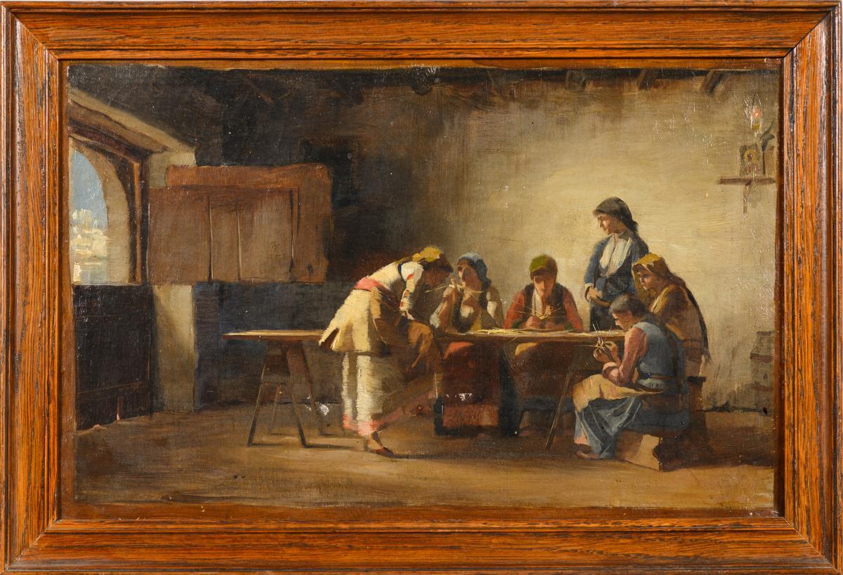 Stubeninterieur mit mehreren Frauen bei der Handarbeit. Leichte Altersspuren.