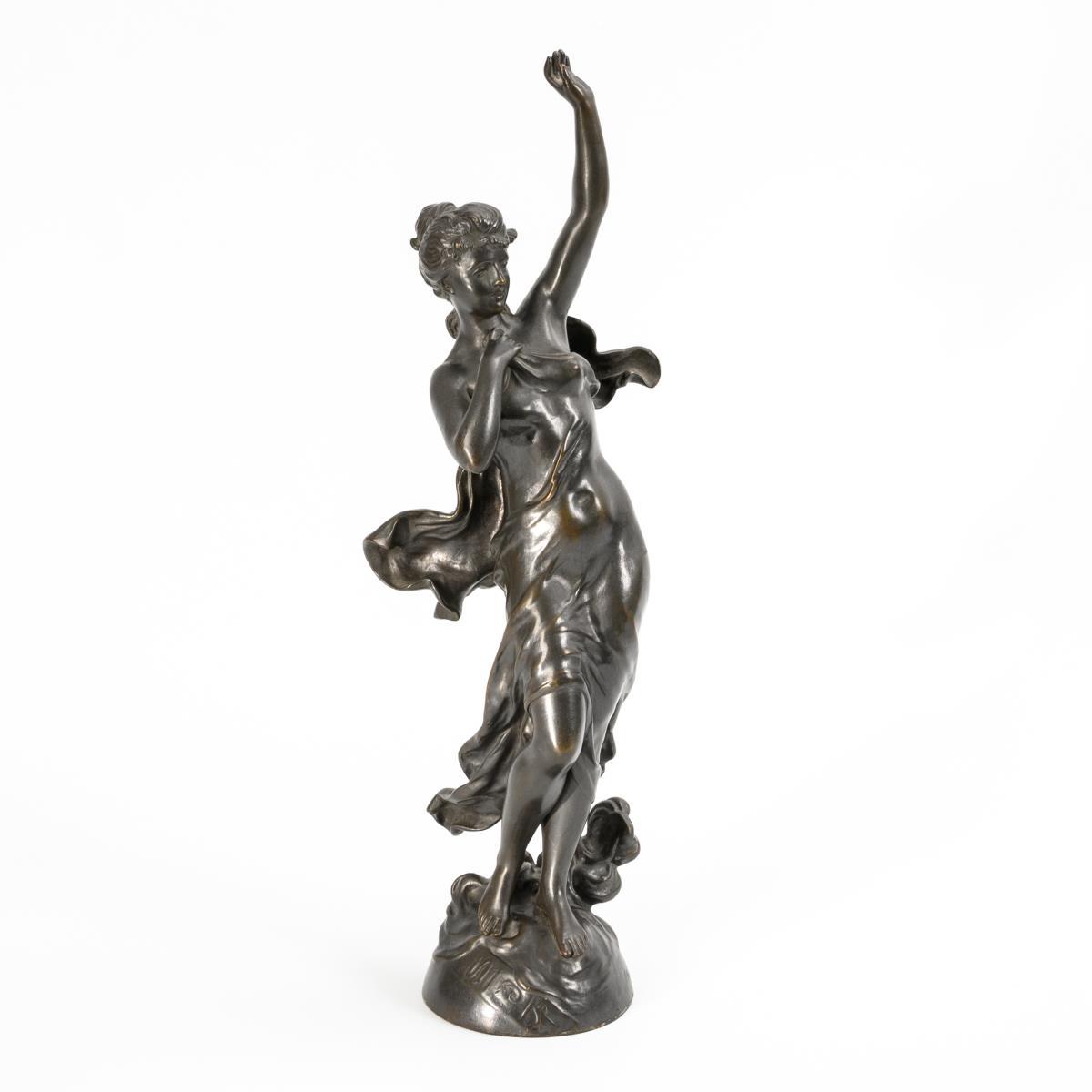 Auf dem Globus mit Tierkreiszeichen und Wolken stehende Schönheit mit erhobenem Arm und bewegtem Gewand (Aurora oder Allegorie des Morgensternes). 1 sichtbare Armnaht, sonst minimale Alters-/Gebrauchsspuren.