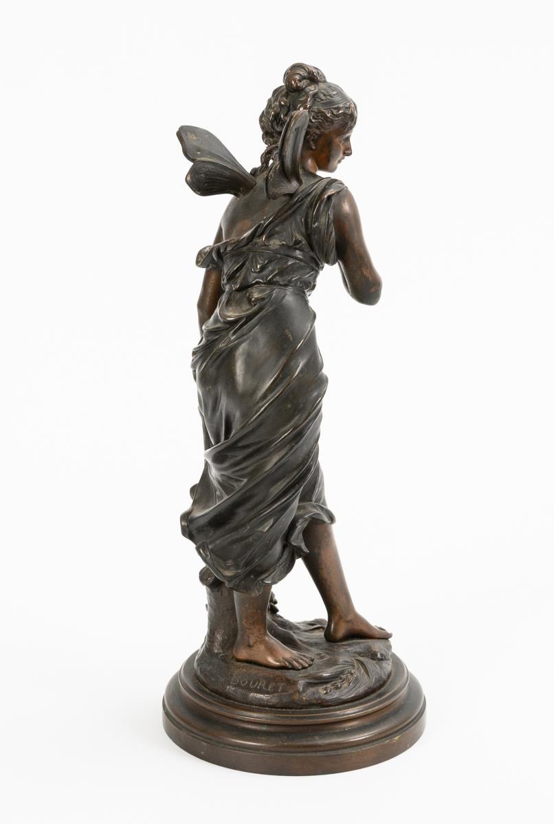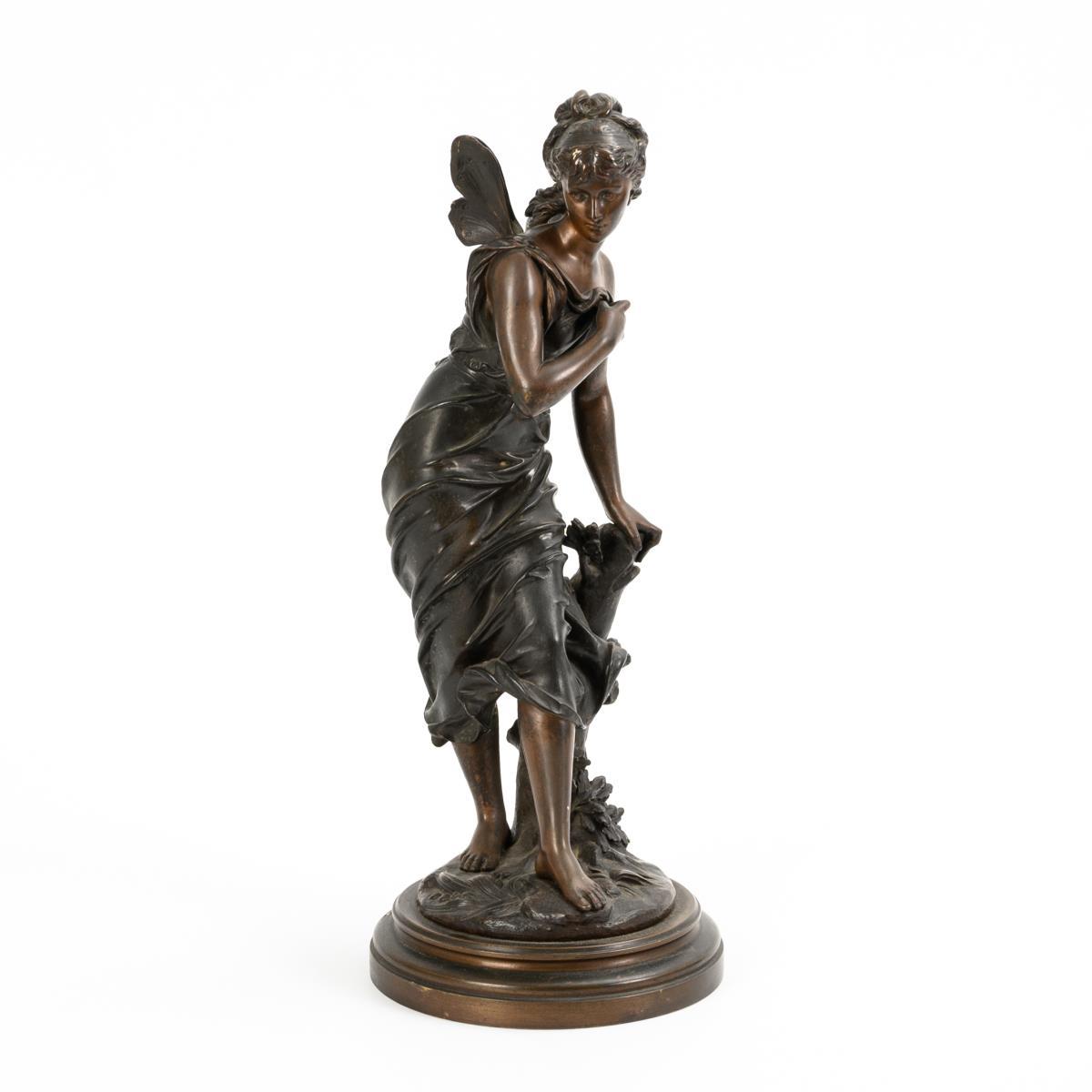 Sich auf den bewachsenen Baumstumpf stützende geflügelte Schönheit. Fleckige Patina mit kleineren Kratzern.