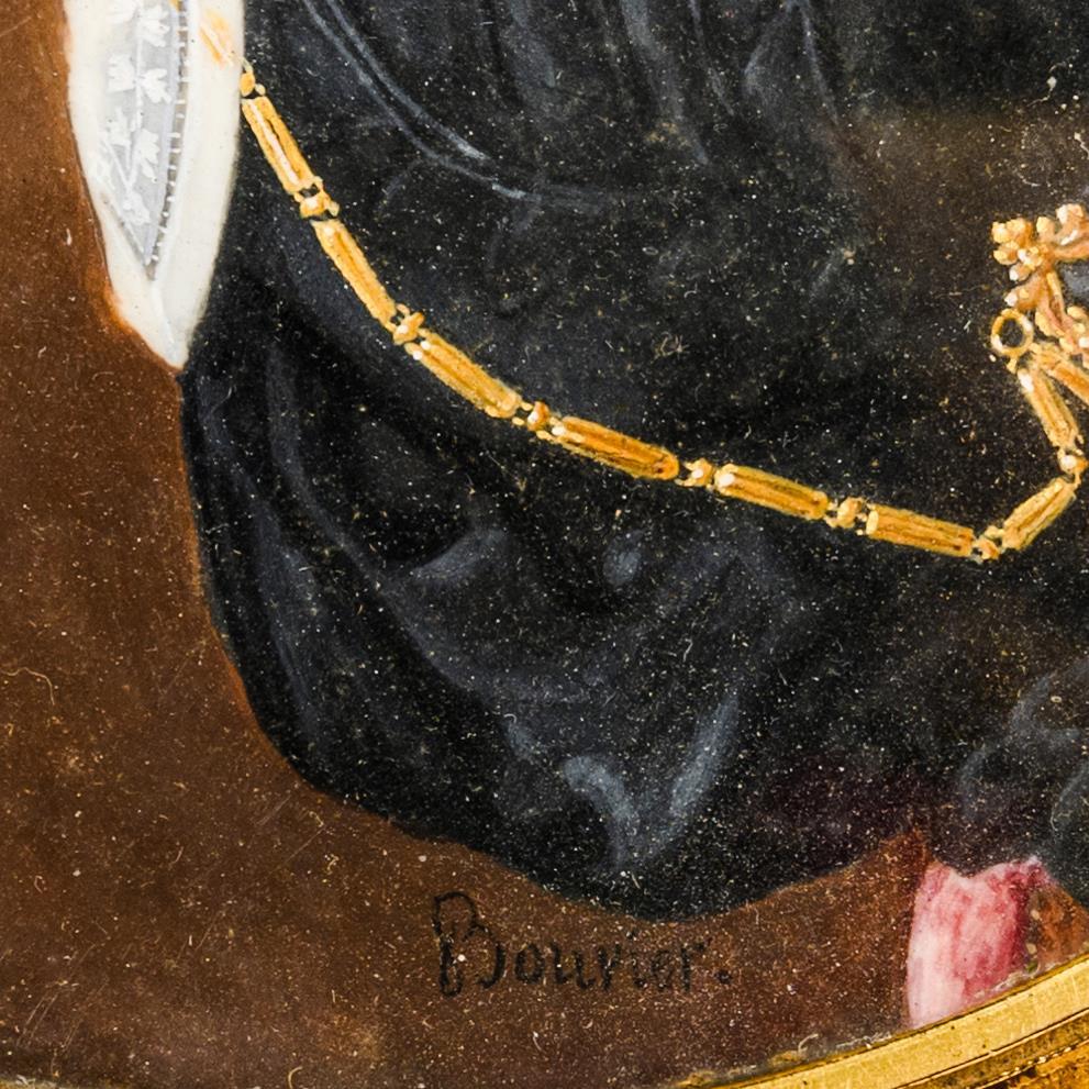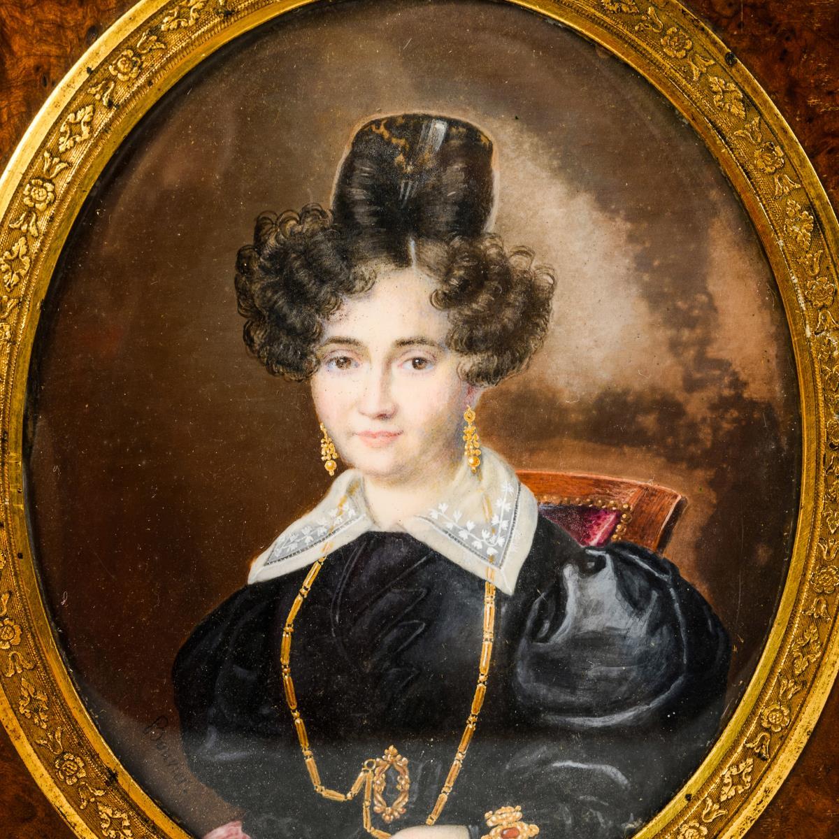 Sehr fein gemaltes Bildnis der sitzenden Frau im schwarzen Kleid mit reichem Goldschmuck. Hintergrund wohl vom Künstler retuschiert. Kleine Furnier-Fehlstellen am Rahmen.
