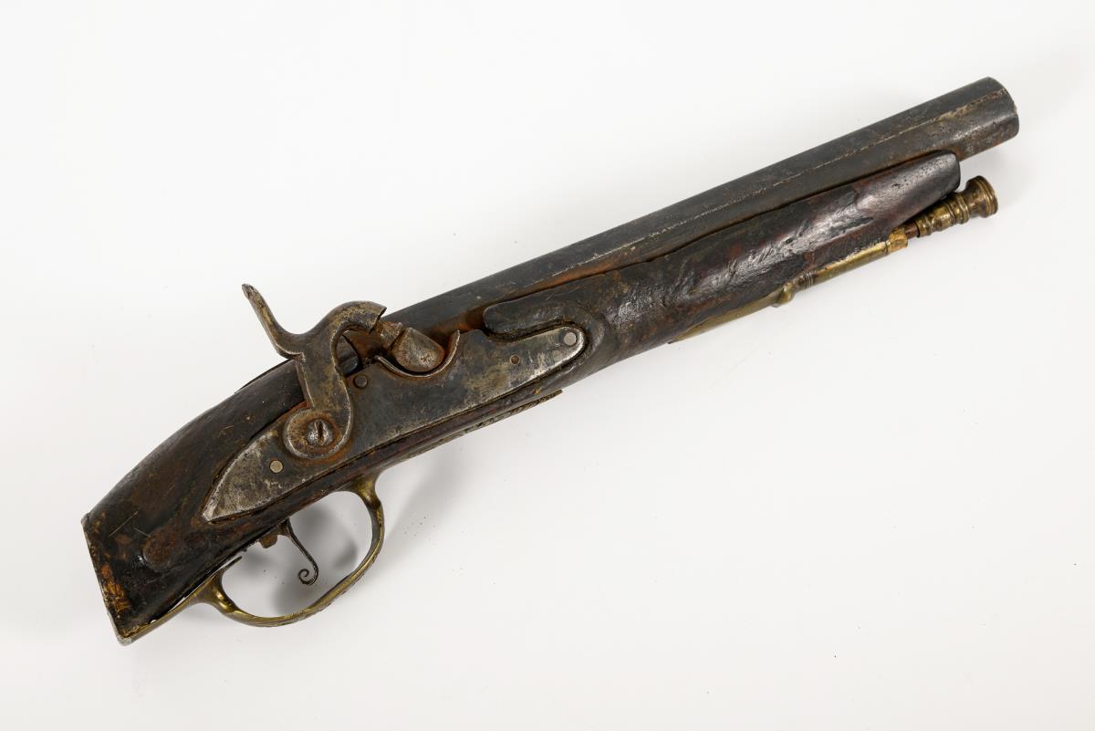 Achtkantiger Lauf mit 15 mm Kaliber. Abzugsbügel-Schutz verziert. Der fehlende Kolben konnte durch ein Steckscharnier angebaut werden. Alters- und Reparaturspuren, Ladestock etwas gekürzt.