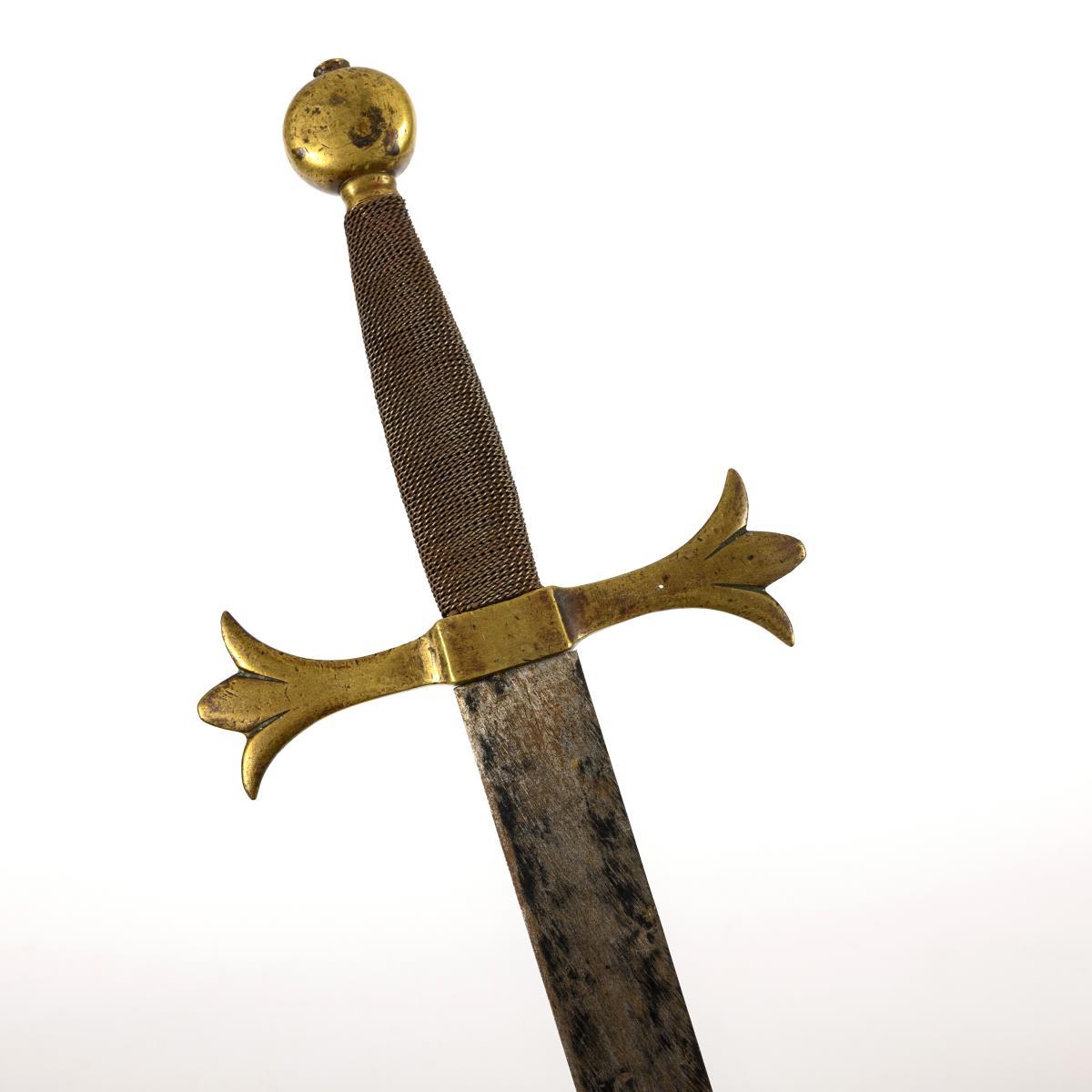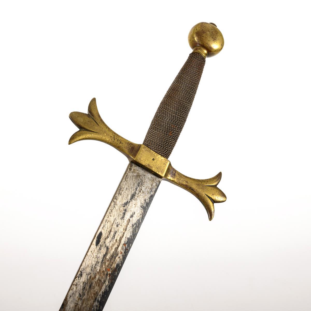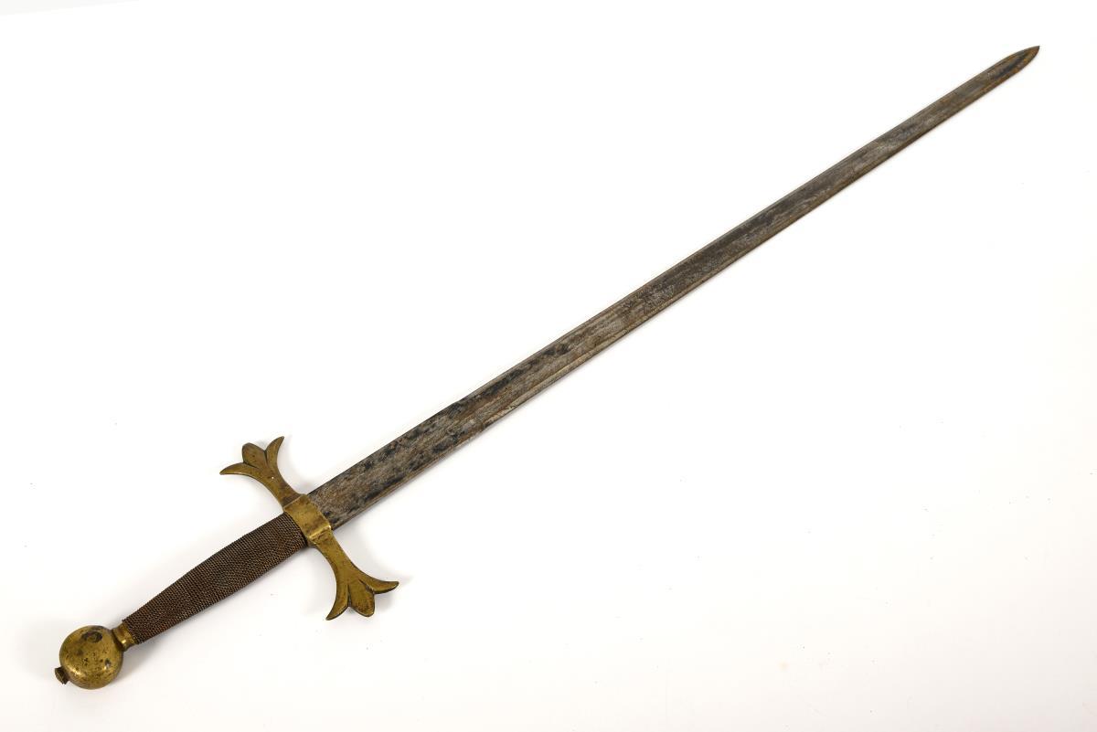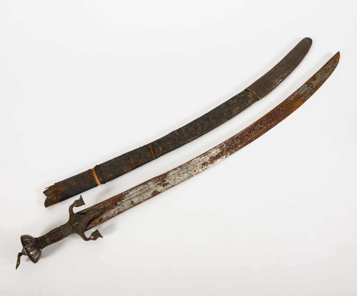 Anderthalb-Händer mit gerader Klinge und Messinggefäß. L 97 cm. / Säbel in Lederscheide, Klinge mit drei Hohlschliffen und stark korrodiert. L 97 cm. / Haumesser mit breiter Klinge, afrikansicher Typus. Griff mit Metalldornen. L 54 cm. / Chaibermesser mit verzierter Klinge und Griff. L 35 cm. / Kurzschwert mit beschnitztem Griff, wohl indonesischer Raum, Klinge mit starken Korrosionsnarben. L 53 cm. / Dekorationswaffe in Form einer Steinschlosspistole. L17 cm.