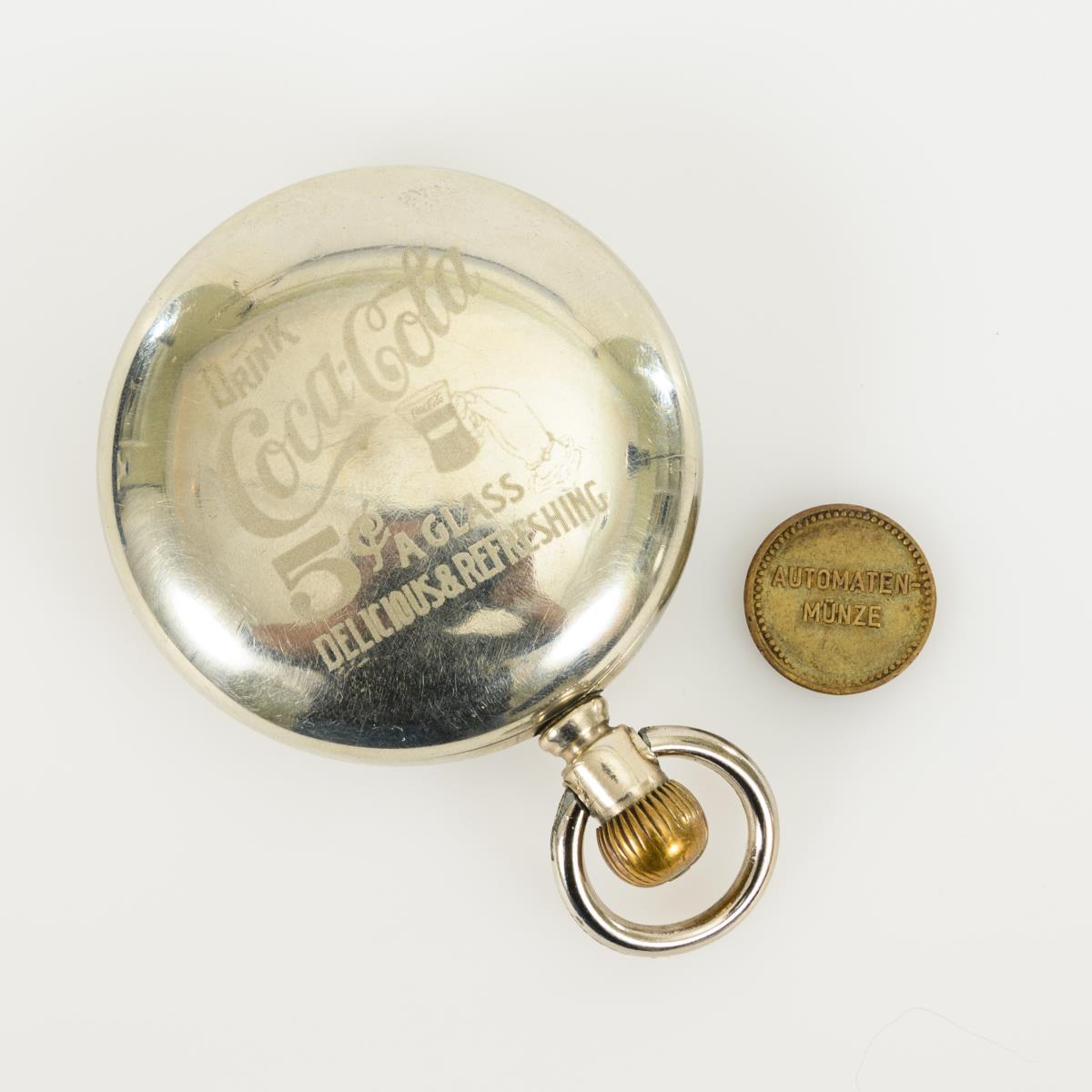 Coca Cola-Werbetaschenuhr und Coca Cola-Automatenmünze. American Waltham Watch Co.