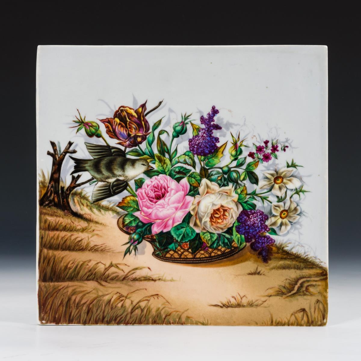 Quadratische Platte mit der Darstellung eines an einem Blumenkorb mit Rosen,