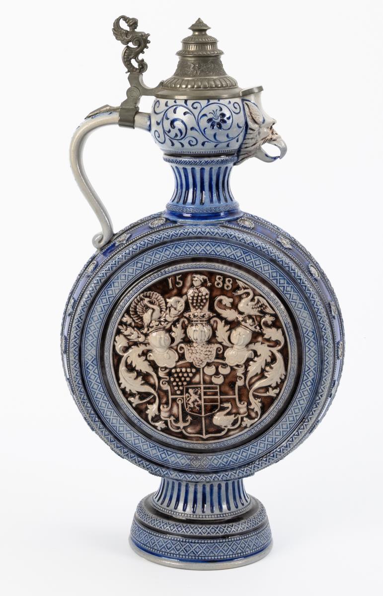 Reliefkanne mit platter Wandung, bauchigem Mündungskopf mit Schnabelmaskaron, Bandhenkel, Rundfuß. Historistischer Dekor mit Helm- und Wappenzier, bezeichnet "1588". Fasson-Zinndeckel mit Figurendrücker.