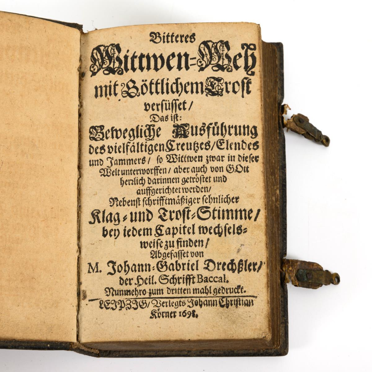 "... Das ist: Bewegliche Ausführung des vielfältigen Creutzes, Elendes und Jammers, so Wittwen zwar in dieser Welt unterworffen, aber auch von Gott herrlich darinnen getröstet und auffgerichtet werden, Nebenst schrifftmäßiger sehnlicher Klag- und Trost-Stimme, bey iedem Capitel wechselsweise zu finden".