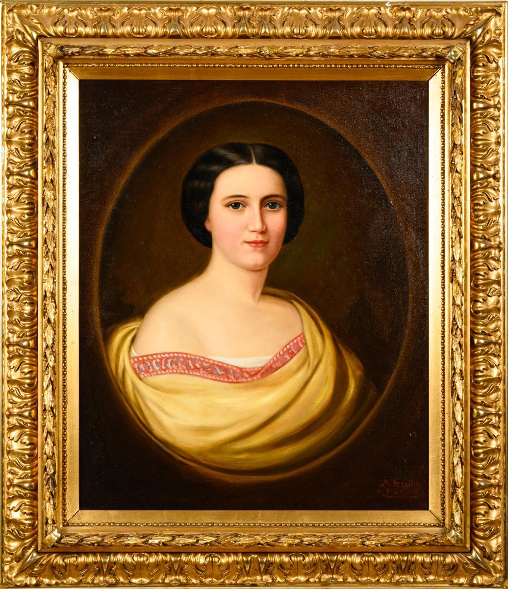 Porträt einer jungen Frau mit dunklem Haar und im gelben Gewand. Leichte Altersspuren.