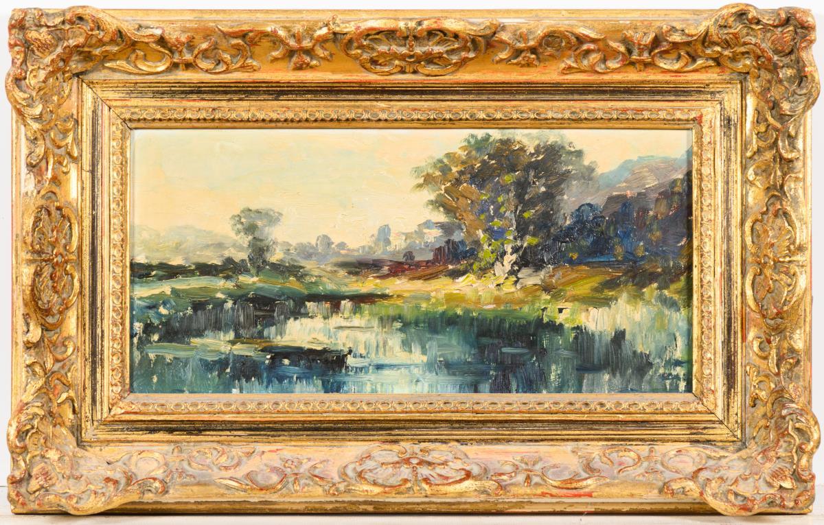 14 x 30 cm. Gerahmt : 26 x 40 cm (Goldstuckrahmen).