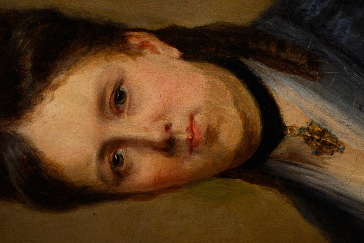 Porträt einer jungen Frau im blauen Kleid mit hochgesteckten Haaren und goldenem Anhänger. Eine restaurierte Stelle mit Hinterklebung.
