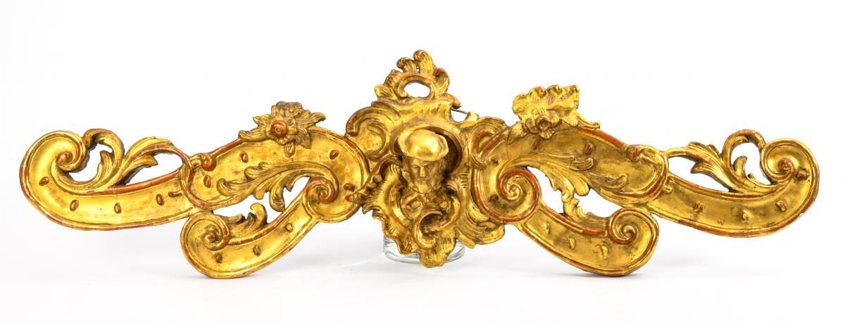Vollplastischer Renaissance-Kopf in barocker Rocaillen-Kartusche sowie seitliche große Voluten mit Blattbesatz. Vergoldung berieben, minimale Haarrisse, kleine Ausbesserungen.