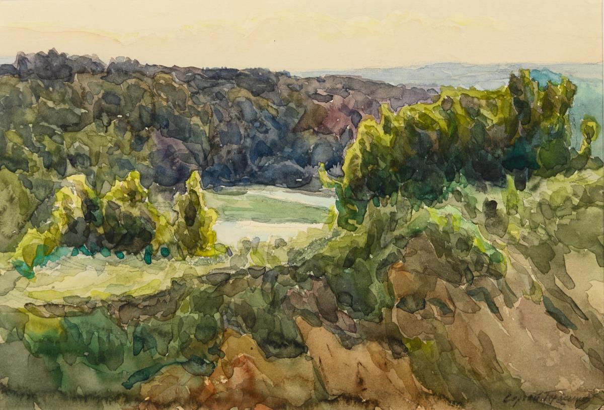 Bergige Landschaft mit einem gewundenen Fluss zwischen den Wäldern.