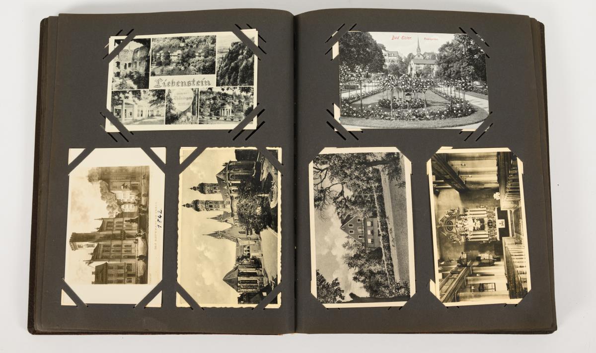 Ca. 180 Ansichtskarten von Thüringen, um 1920. Im braunen Lederalbum.