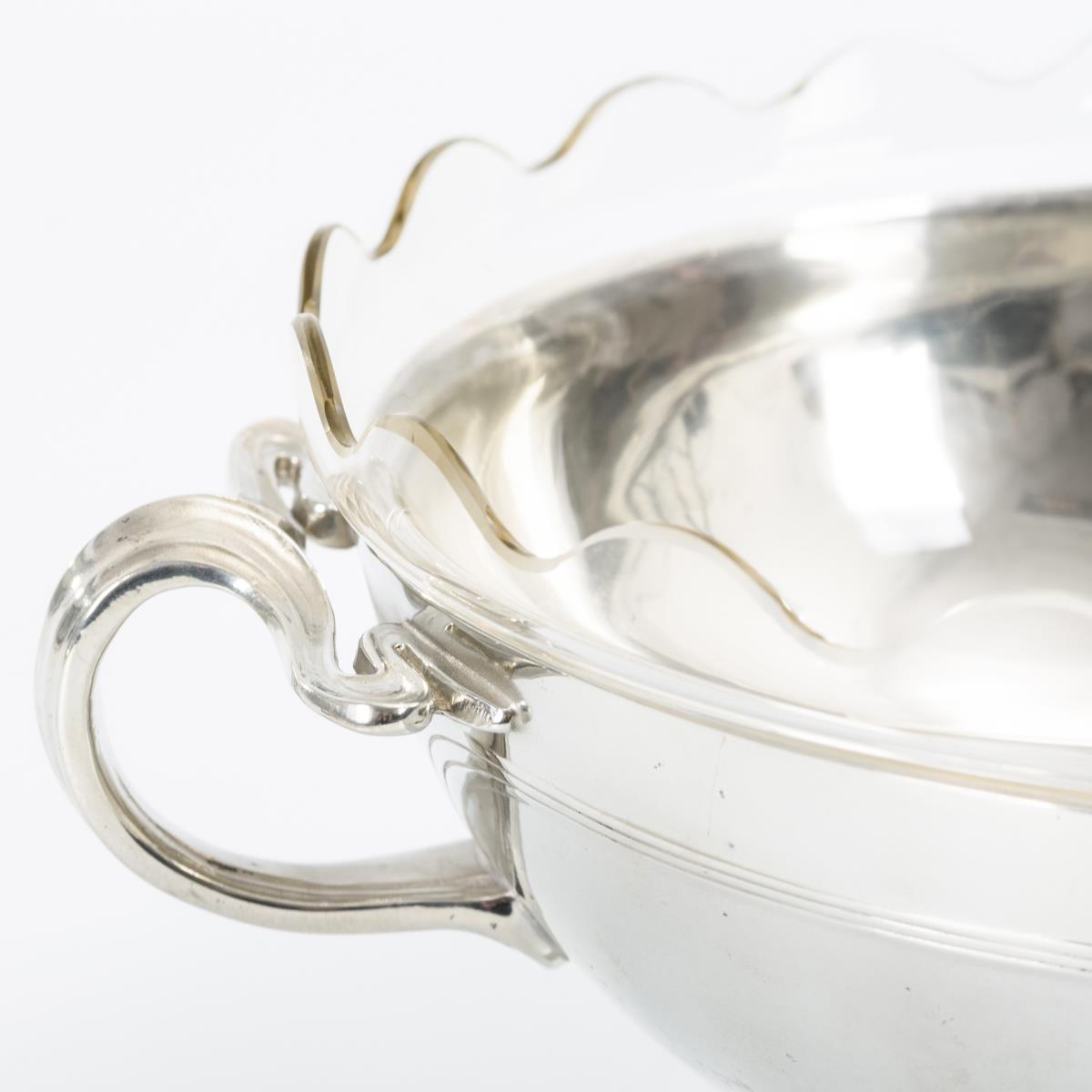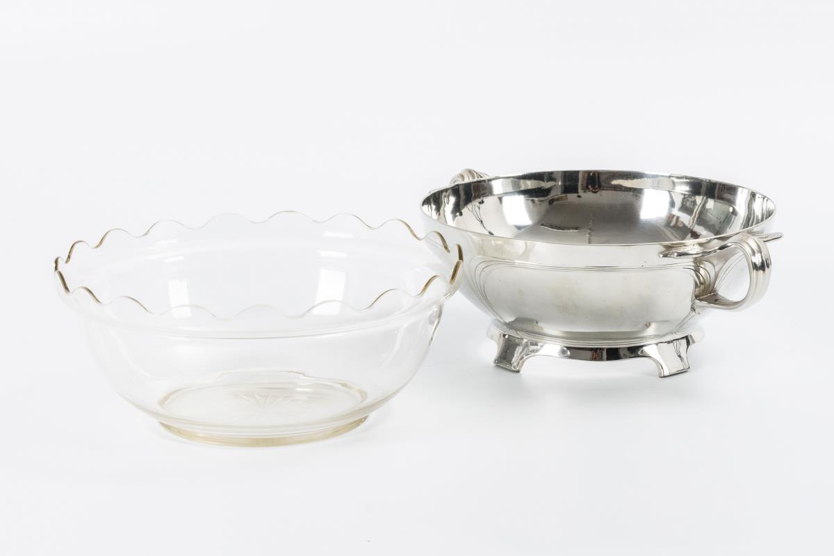 Halbkugelige Schale mit Bandornamentik und vegetabilen Griffen. Originaler Glaseinsatz mit Wellenrand und Bodenschliffstern.