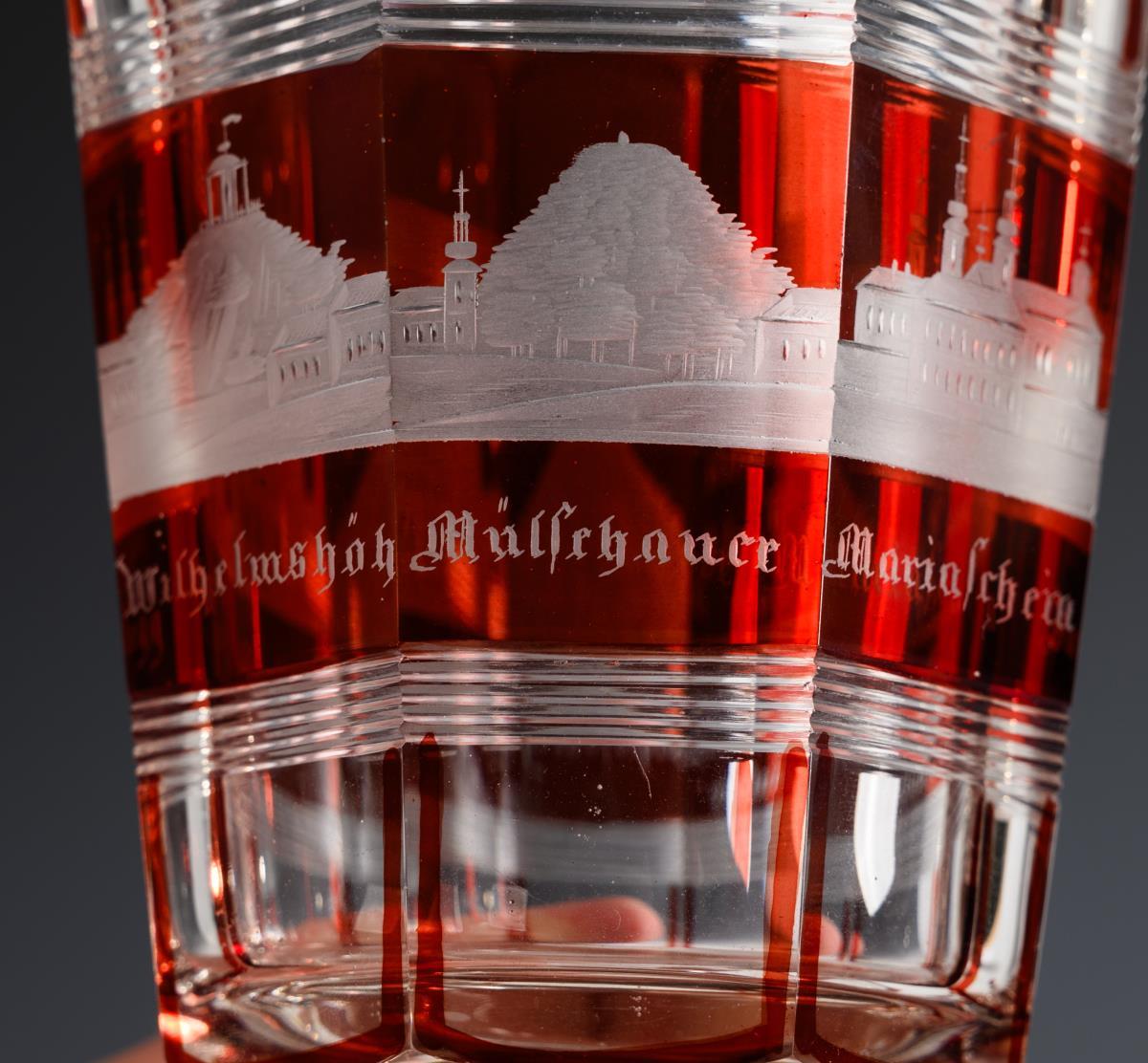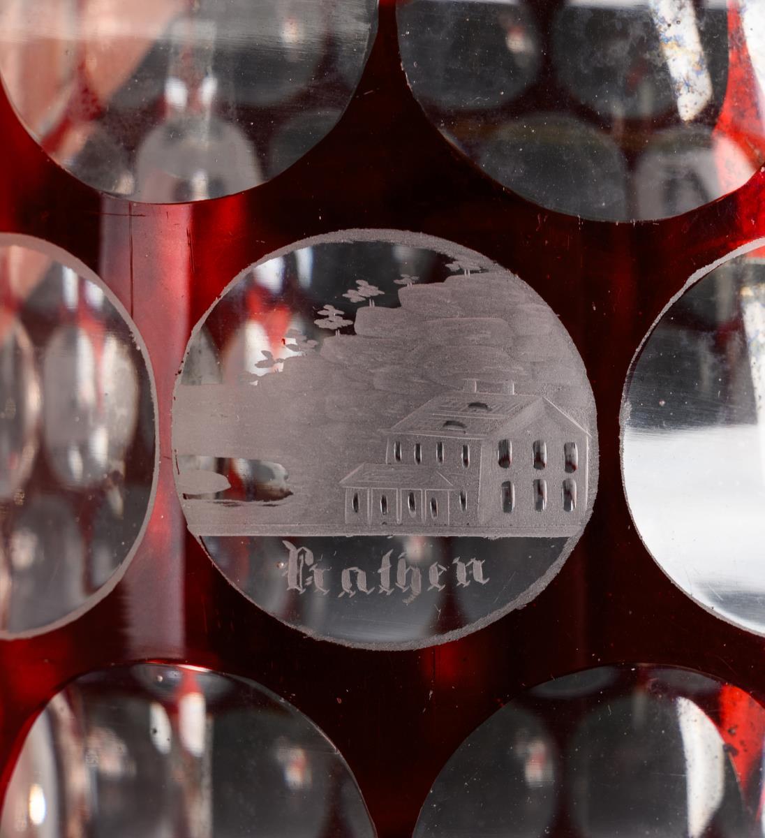 3 Ansichtengläser aus farblosem, rot gebeiztem Glas: Karaffe und Becher mit Linsenschliff und gravierten Ansichten der Sächsischen Schweiz (H 21,5 cm); facettiertes Kelchglas mit gravierten Ansichten von Teplitz (H 12 cm). / 2 Salieren aus farblosem Glas mit rotem Überfang, Silbermalerei und Silberfuß (13 Lot gepunzt; H 6,5 cm). Bestoßung am Karaffenrand und -stopfen, Fuß des Kelchglases bestoßen, 1 Salierenrand bestoßen.
