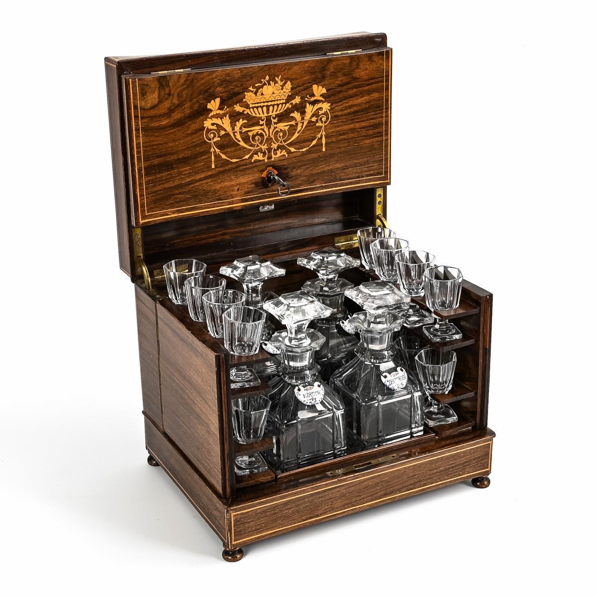 Abschließbare Schatulle mit feiner Ornament-Marketerie in der Front und auf dem nach oben aufklappbaren Deckel. Die Seitenwände sind seitlich aufklappbar. Innen 4 Glaskaraffen mit beschrifteten Hängeetiketten sowie 14 gleiche Gläser. Schatulle wenige Alters-/Gebrauchsspuren (1 Fadeneinlage fehlt, 1 Seitenflügel schwergängig), an den Flaschen vereinzelte Chips, 2 Gläser fehlen.