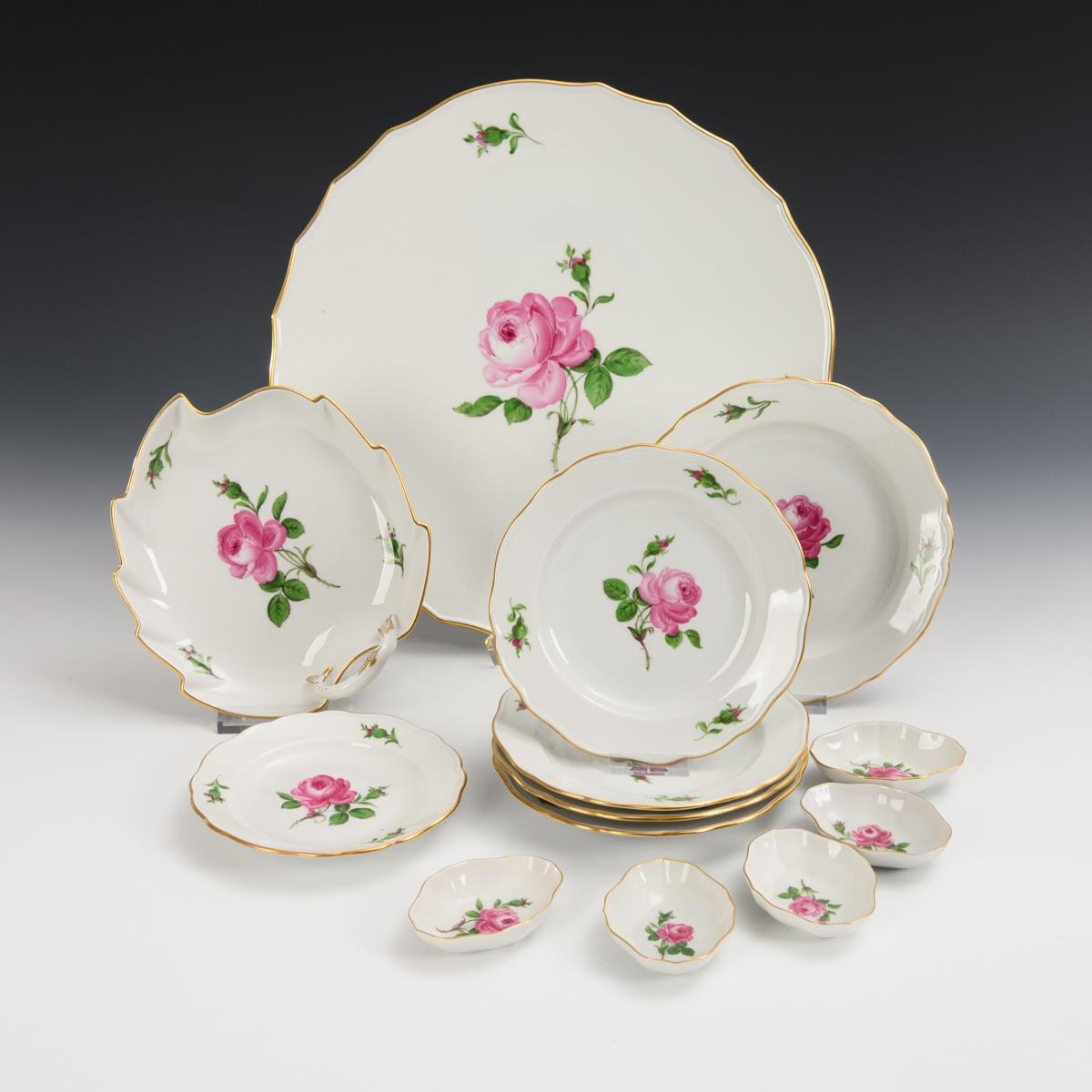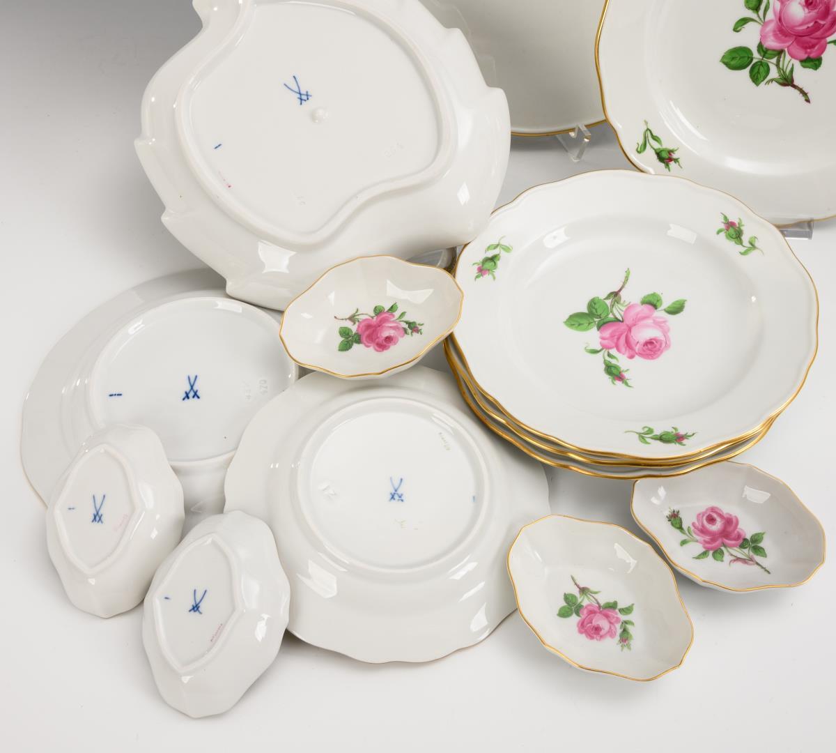 Form "Neuer Ausschnitt". 6 verschiedene Teller (Ø 4x 16,5 cm, 1x 18,5 cm und 1x 14 cm), 5 Vierpassschälchen (L 8,5 cm), 1 Blattschale (L 19 cm) und 1 Tortenplatte (Ø 32,5 cm).