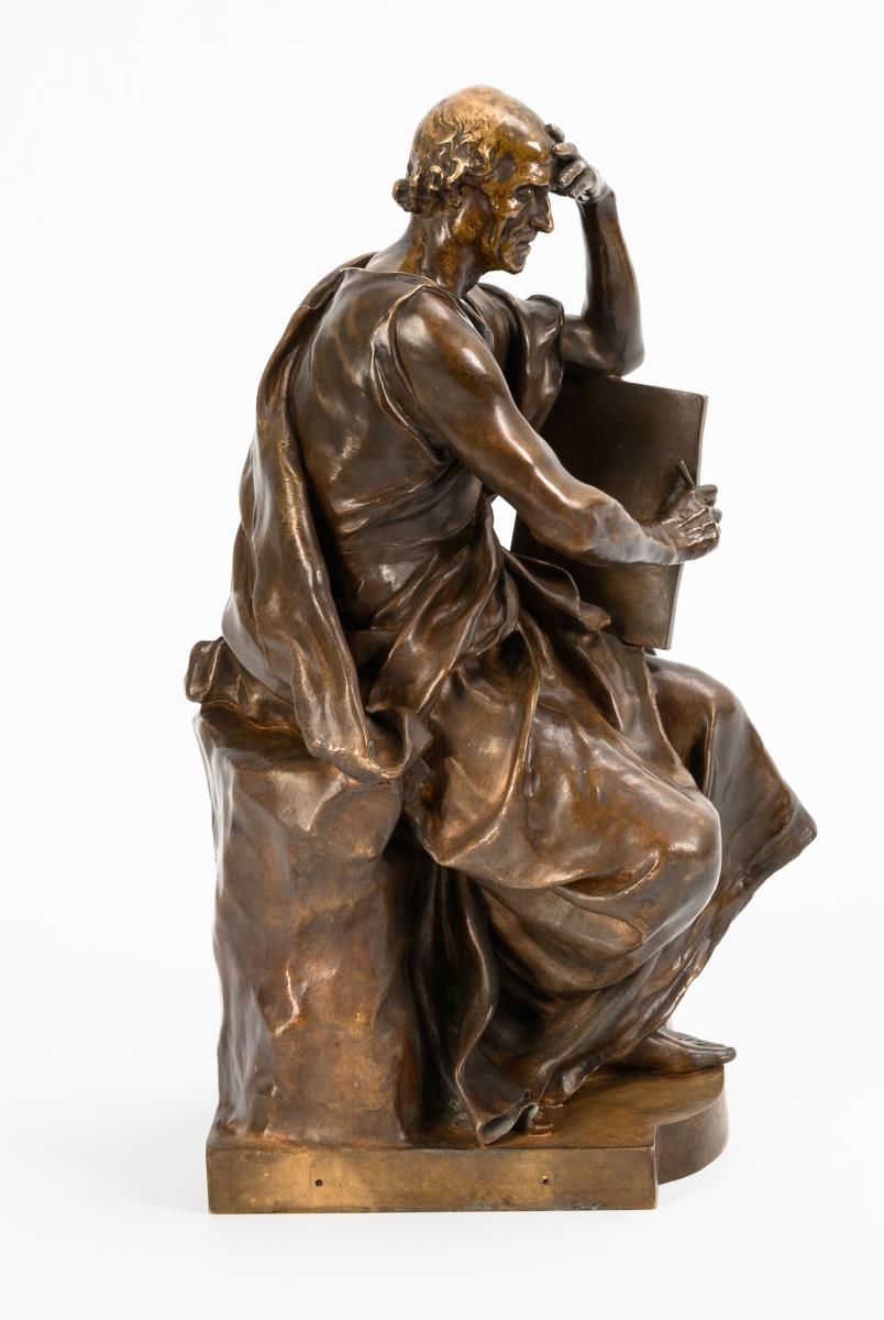 Gedankenversunken sitzendes Autorenbildnis mit leerer Schrifttafel. Nach einer vom Künstler geschaffenen allegorischen Figur am Grabmal des Generals LaMoricière in der Kathedrale von Nantes (enthüllt 1879). Patina berieben, Bohrlöcher von entfernter Plakette an der Bronze-Plinthe.
