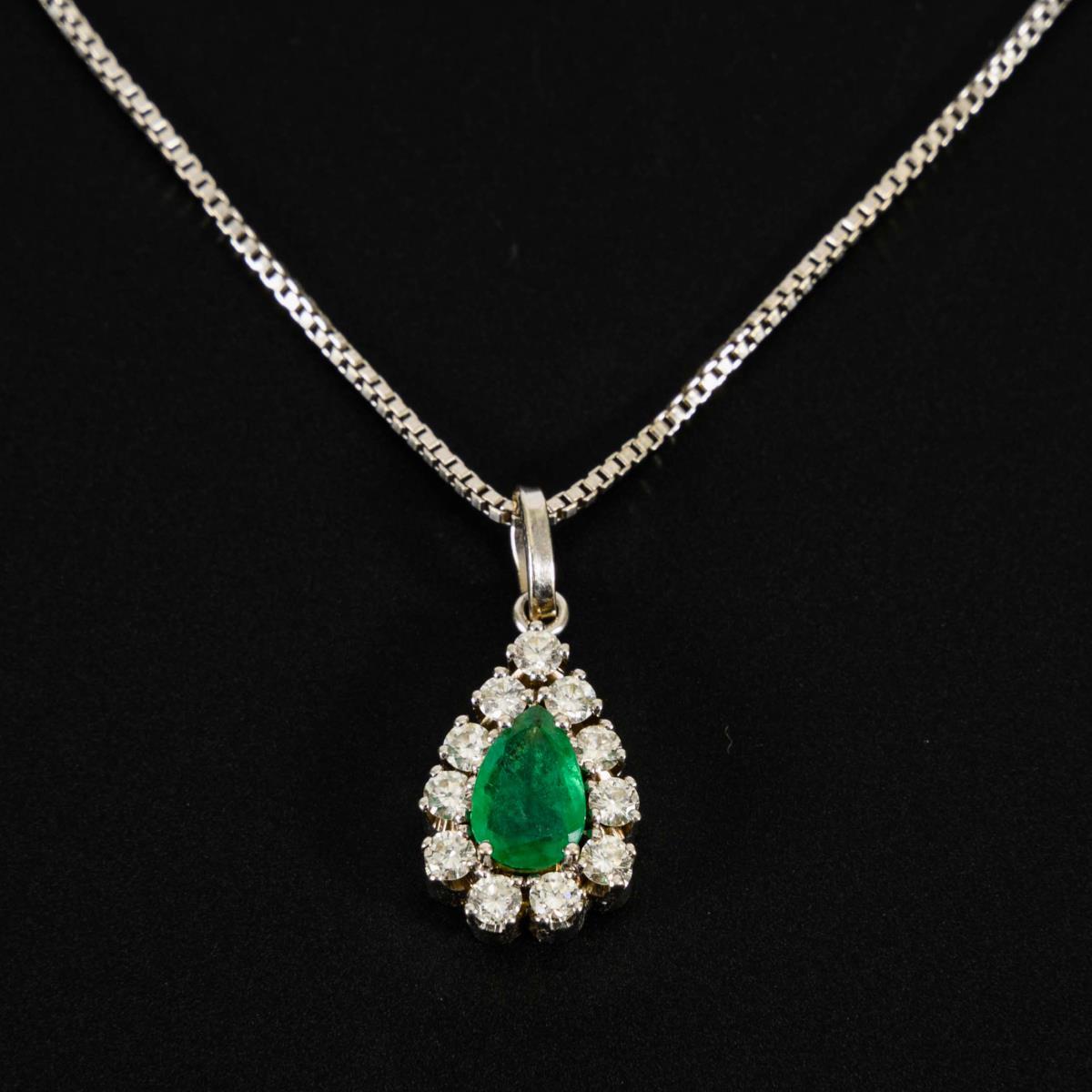 Krappengefasster Smaragd, umgeben von 11 chatongefassten Brillanten. Venezianerkette mit Ringfederschließe.