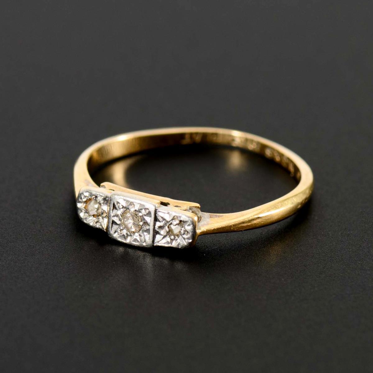 3 kleine, eingelassene Diamanten zwischen schmaler Schiene. 1 Diamantrose mit kleinem Randausbruch.