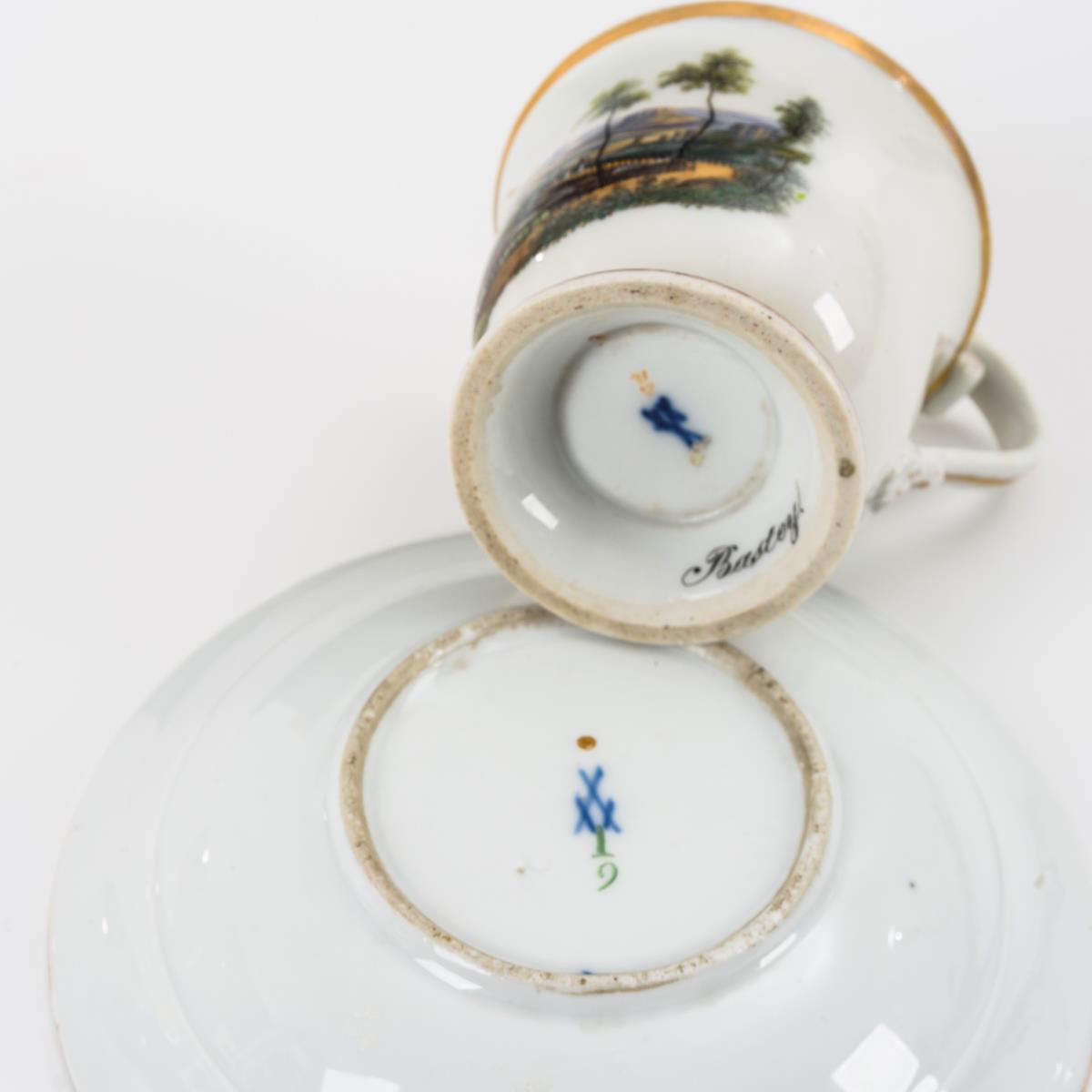 Polychrome Malerei, Goldstaffage. H Tasse 9 cm, Ø ergänzte Untertasse 14,5 cm.