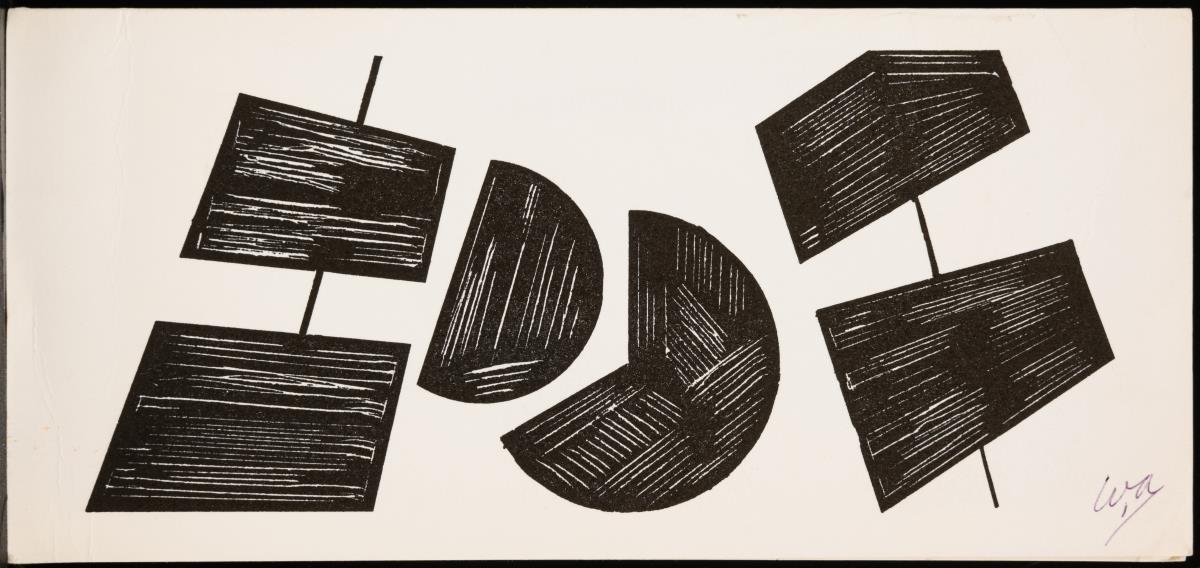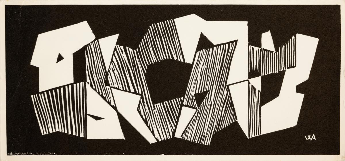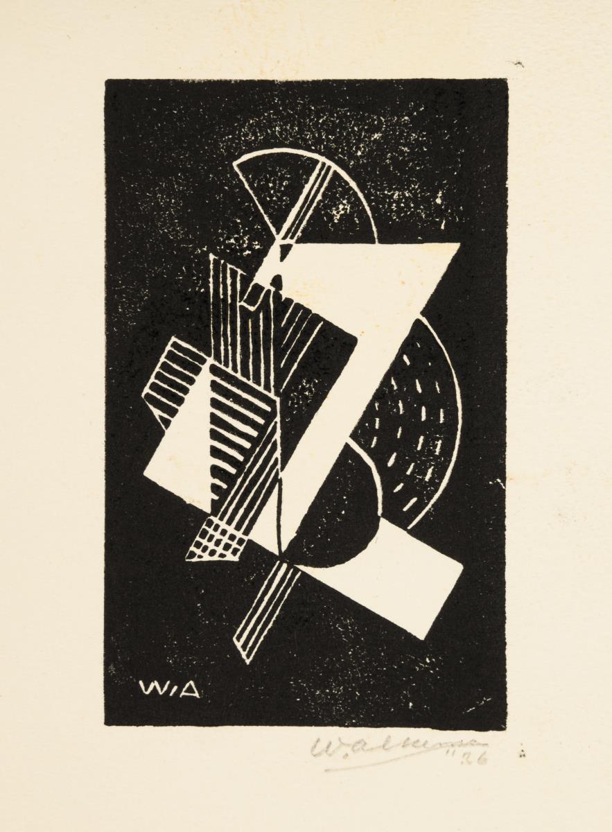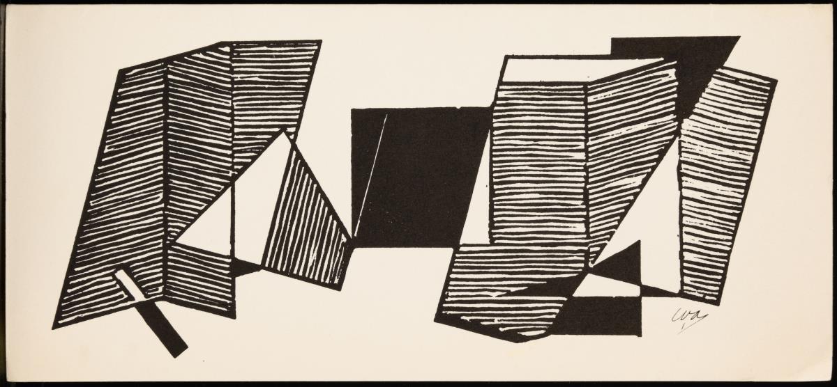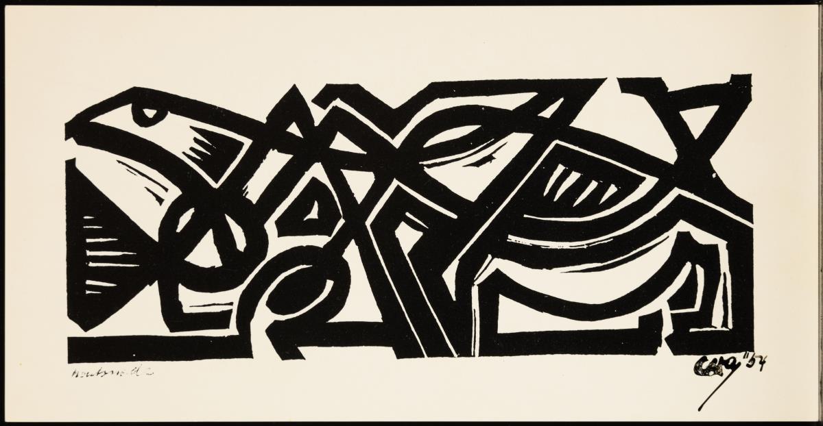 11 verschiedene kleinformatige Neujahrsgrußkarten des Künstlers und seiner Gattin Dora, teils mit persönlichen Nachrichten an Ingelore in deutscher Sprache von 1986 und 1995, teils signiert, handbemalt und datiert | 1 kleinformatiger, früher Linolschnitt mit geometrischer Komposition, Druckplatte: 10,8 x 6,2 cm, Blatt: 16,5 x 13,2 cm, Bleistiftsignatur, datiert [19]26 und Reproduktionsabzug sowie 2 gerahmte Reproduktionsabzüge eines Portraits des Künstlers, gerahmt und hinter Glas: 33 x 23 cm und eines geometrisch-abstrakten Holzschnittes, gerahmt und hinter Glas: 24 x 18 cm.