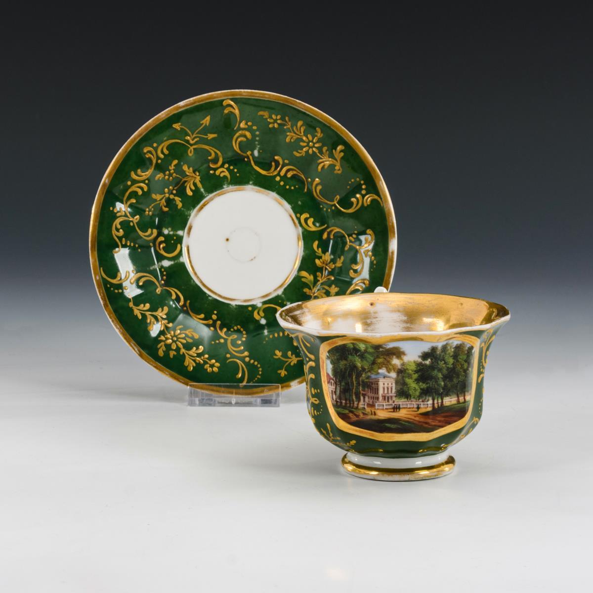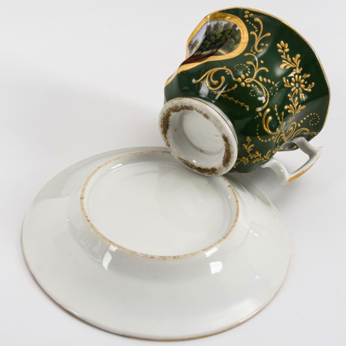 Grüner Fond, polychrome Malerei und Goldstaffage. H Tasse 6,5 cm, Ø originale Untertasse 13,5 cm.